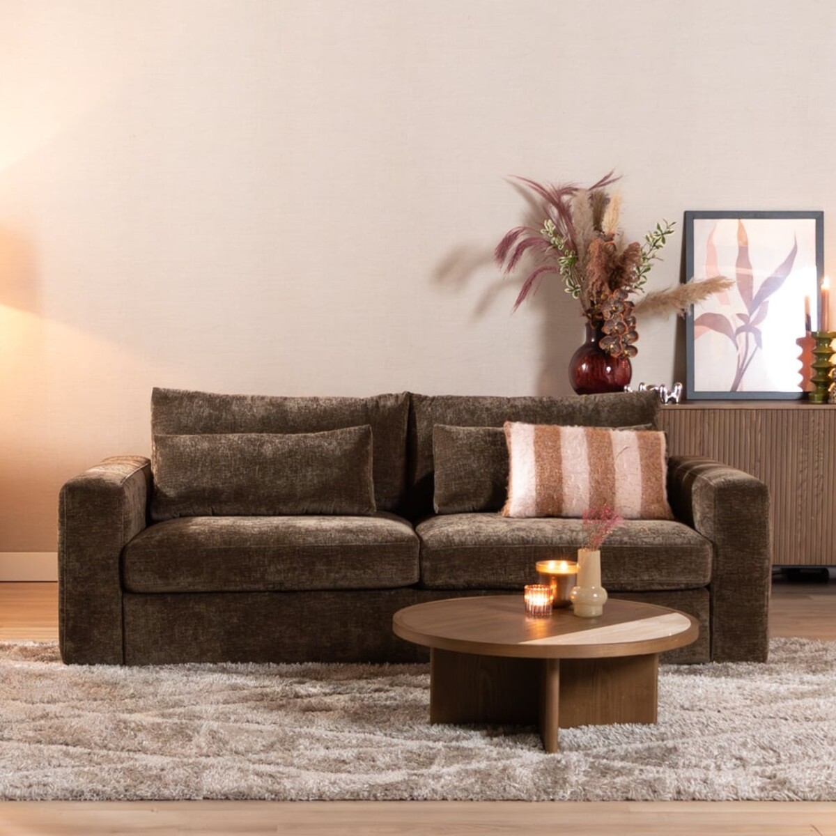 Das 3-Sitzer-Sofa Kyle ist mit Eddy Chenille bezogen, einem hochwertigen Stoff aus 100 % Polyester, wasserabweisend und nach REACH- sowie OEKO-TEX-Standards zertifiziert. Chenille zeichnet sich durch eine volle, weiche Struktur aus und bietet besonderen Sitzkomfort. Der Stoff hat einen Martindale-Wert von 60.000, was bedeutet, dass das Sofa extrem langlebig und für intensive (tägliche) Nutzung geeignet ist. Das Sofa ist mit einer wasserabweisenden Oberflächenbeschichtung versehen, sodass Flüssigkeiten nicht sofort eindringen und leicht entfernt werden können. Hinweis: Durch die Chenille-Struktur kann bei bestimmtem Lichteinfall Shading auftreten, was für natürliche Farbvariationen sorgt. Der Rahmen ist robust mit Nosag-Federn, Holzplatten sowie Buchen- und Kiefernholz ausgeführt, wodurch das Sofa eine lange Lebensdauer und eine stabile Basis erhält.