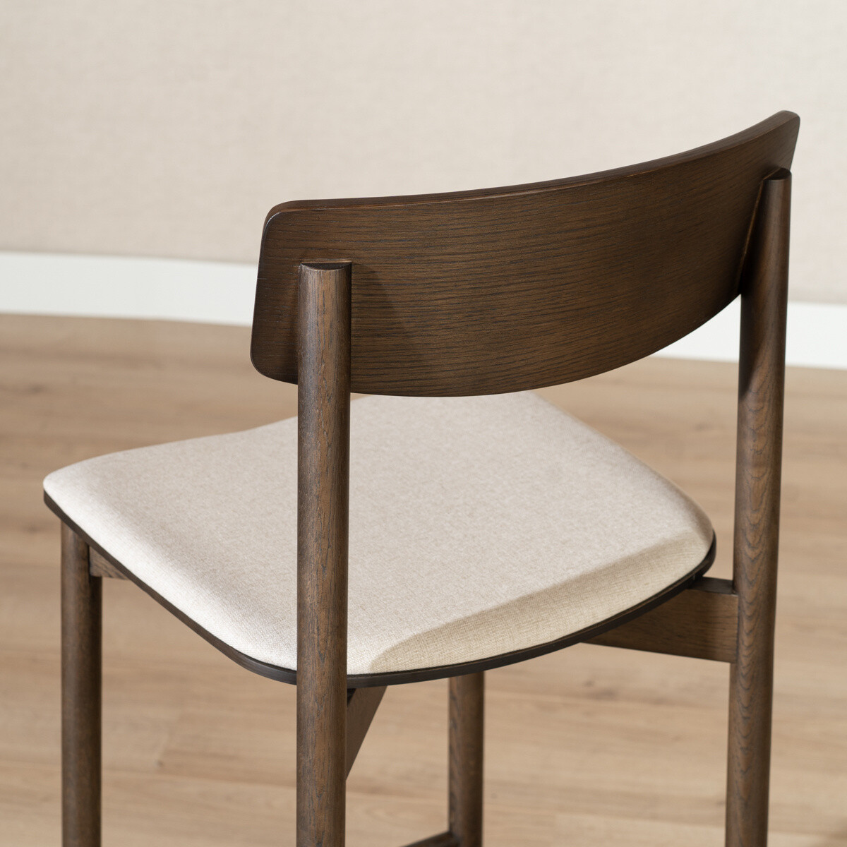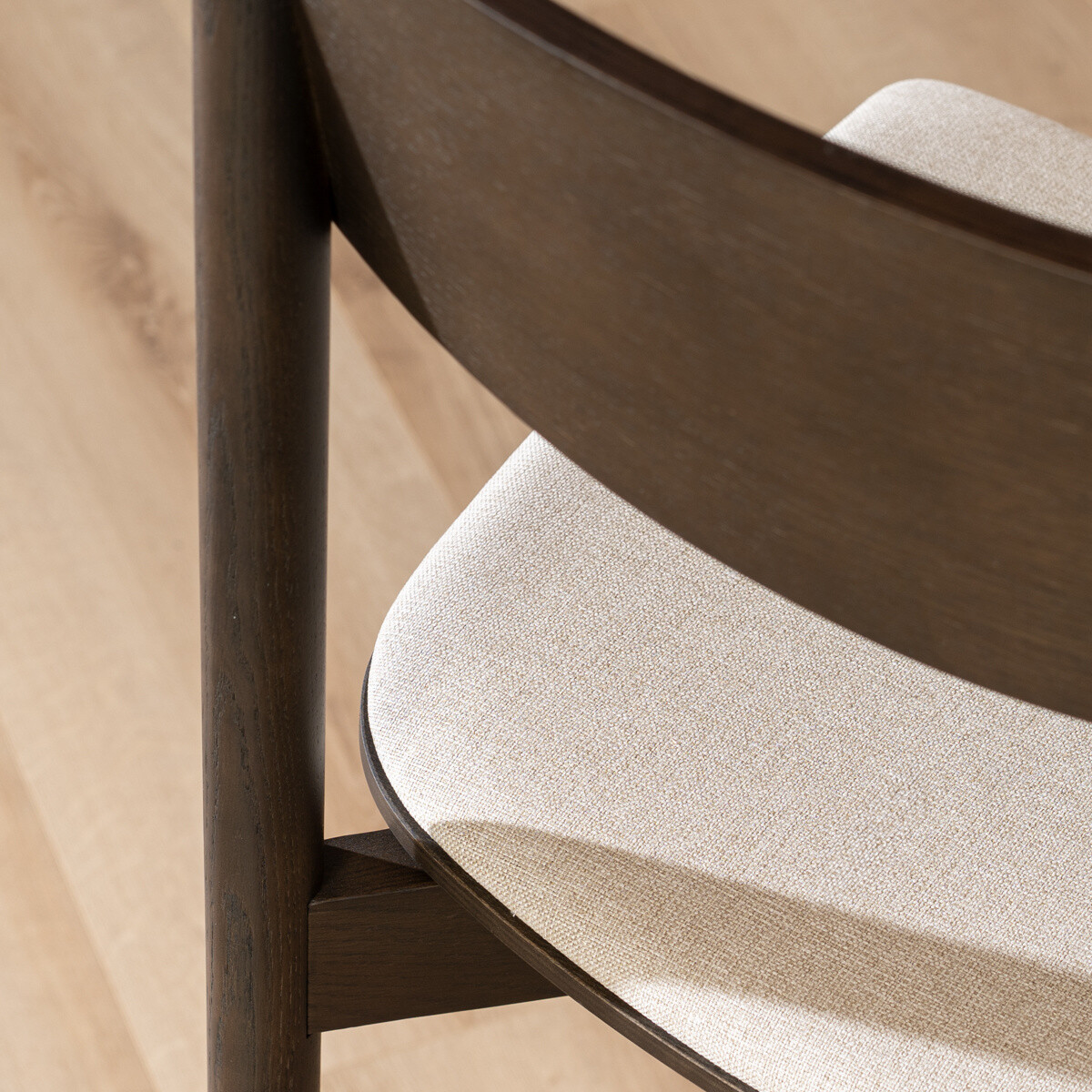 Die Sitzfläche und Rückenlehne bestehen aus Multiplex mit einer Furnierschicht, während das Gestell aus 100 % massivem Eichenholz gefertigt ist. Das gepolsterte Sitzkissen ist mit wasserabweisendem Leinen in Off-White bezogen, wodurch es pflegeleicht und widerstandsfähig gegenüber Flecken ist.