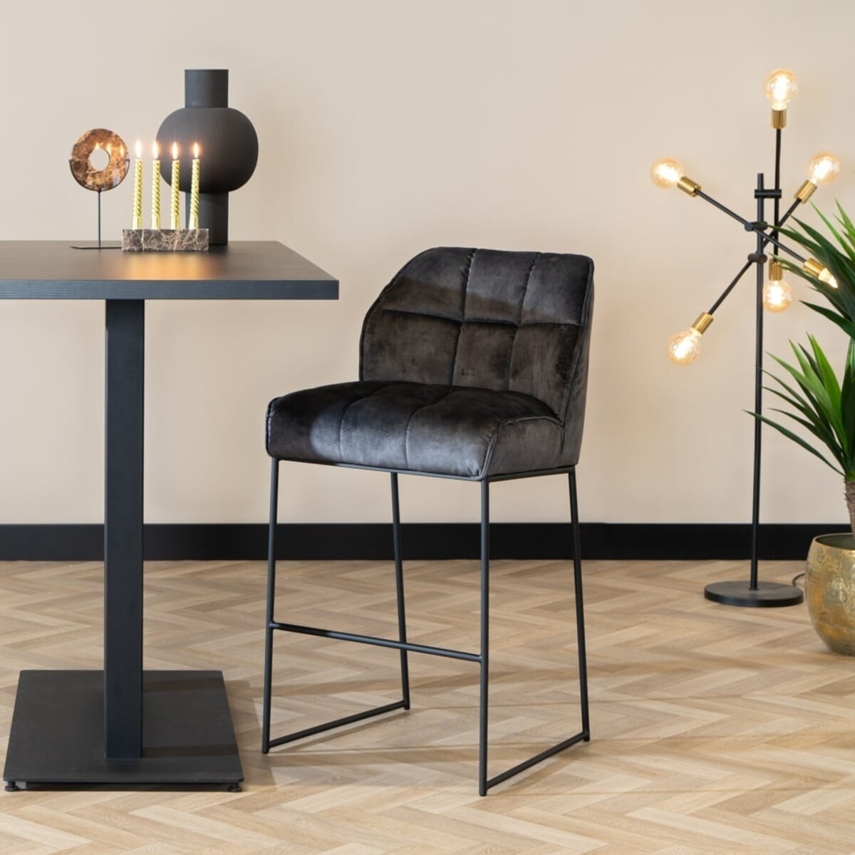 Der Barhocker Janna ist aus einem luxuriösen Samtstoff gefertigt und ist wasser- sowie schmutzabweisend. Samt wird auch Velours genannt und ist bekannt für sein luxuriöses und glänzendes Aussehen. Der Stoff hat einen Martindale-Score von 100.000. Dies bedeutet, dass dieser Samtstoff extrem verschleißfest ist! Dieser Design-Barhocker hat ein schwarzes, pulverbeschichtetes Metallgestell. Dies verleiht ihm einen luxuriösen und dennoch robusten Look. Der Hocker hat markante, robuste Beine, sodass dieser Barhocker sofort in deinem Interieur auffällt! Dank der Kombination des schwarzem Metallgestells mit dem Sitz aus Samt wird der gepolsterte Hocker zum echten Highlight in deinem Esszimmer. Außerdem hat der Sitz an der Rückenlehne ein Rautenmuster eingestickt.