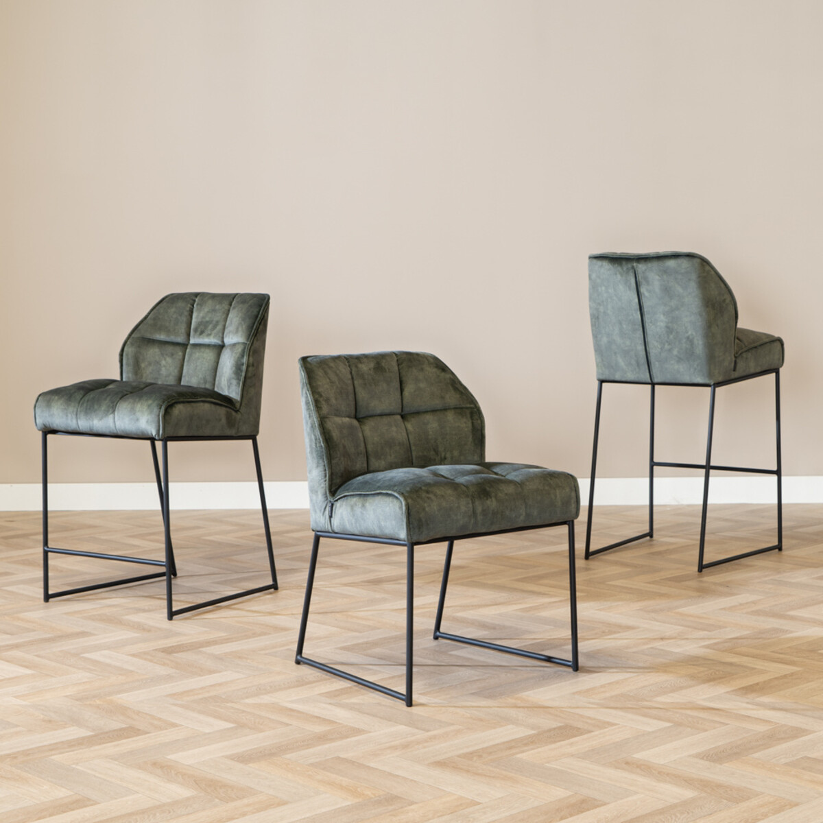 Der Barhocker Janna ist aus einem luxuriösen Samtstoff gefertigt und ist wasser- sowie schmutzabweisend. Samt wird auch Velours genannt und ist bekannt für sein luxuriöses und glänzendes Aussehen. Der Stoff hat einen Martindale-Score von 100.000. Dies bedeutet, dass dieser Samtstoff extrem verschleißfest ist! Dieser Design-Barhocker hat ein schwarzes, pulverbeschichtetes Metallgestell. Dies verleiht ihm einen luxuriösen und dennoch robusten Look. Der Hocker hat markante, robuste Beine, sodass dieser Barhocker sofort in deinem Interieur auffällt! Dank der Kombination des schwarzem Metallgestells mit dem Sitz aus Samt wird der gepolsterte Hocker zum echten Highlight in deinem Esszimmer. Außerdem hat der Sitz an der Rückenlehne ein Rautenmuster eingestickt.