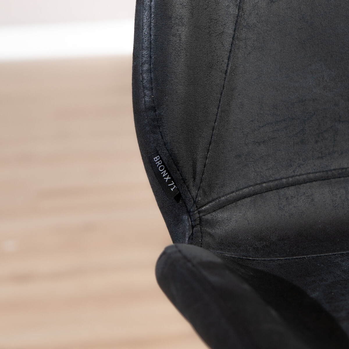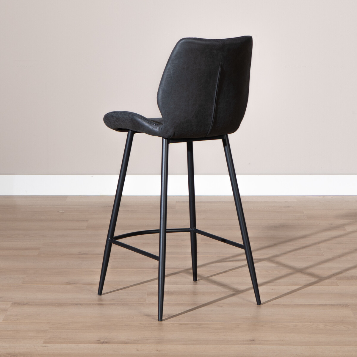 Der Hocker wurde aus hochwertigem, wasserbeständigem Eco-Leder gefertigt. Eco-Leder ist eine Kombination aus Leder und Polyester, das heißt, es ist eine Form von recyceltem Leder. Wenn Muster aus Lederhäuten geschnitten werden, bleiben immer Reste über. Diese Reststücke werden zermahlen und mit Polyester kombiniert. Auf diese Weise entsteht Eco-Leder. Das Material besteht zu 30 % aus Polyester und zu 70 % aus Leder. Eco-Leder hat einige Vorteile gegenüber 100 % Leder: Es ist beispielsweise einfacher sauber zu halten. Außerdem ist es ein sehr feuchtigkeitsbeständiges Material, weshalb also keine Feuchtigkeit absorbiert wird und keine Flecken entstehen. Somit ist der Barhocker auch für Familien mit Kindern ideal!