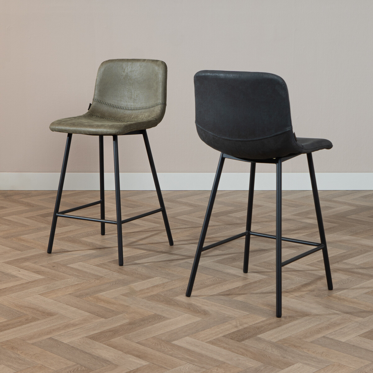 Dieser Barhocker wurde aus wasserabweisendem Eco-Leder gefertigt und ist in verschiedenen Farben erhältlich. Der Hocker ist sehr langlebig, denn er hat einen Martindale-Score von 45.000. Eco-Leder ist eine schöne und nachhaltige Alternative zu 100 % Leder. Eco-Leder besteht nämlich zu 30 % aus Polyester und 70 % aus Leder. Wenn Muster aus Lederhäuten geschnitten werden, bleiben immer Reste über. Diese Reste werden zermahlen und mit Polyester zusammengefügt. Auf diese Weise entsteht Eco-Leder. Das wasserbeständige Material hat einige Vorteile gegenüber 100 % Leder - es ist unter anderem leichter sauber zu halten! Der Barhocker hat die Farbe schwarz, jedoch mit einem anthrazitfarbenen Unterton. Der Stoff ist also nicht tiefschwarz