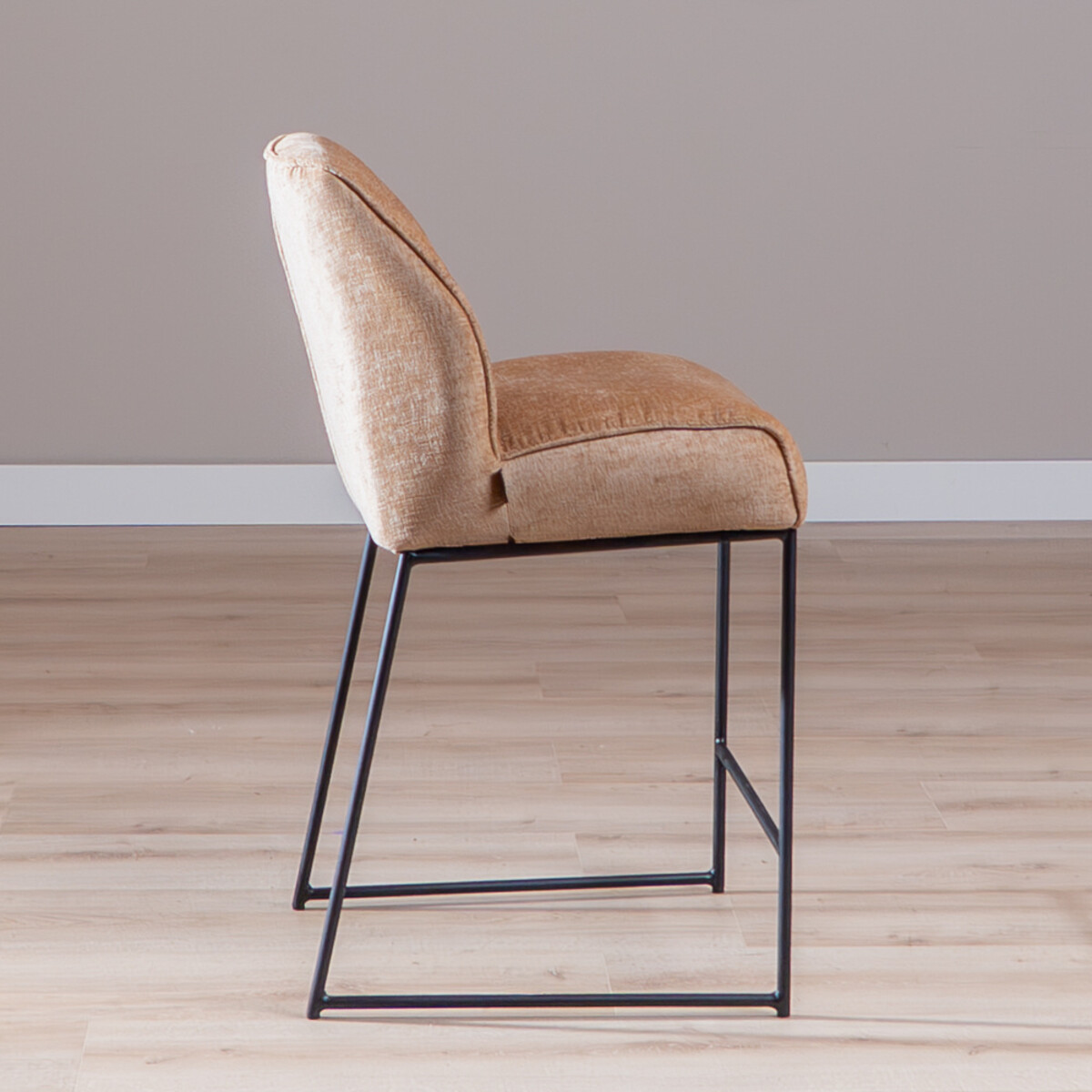 Der Barhocker ist mit einem luxuriösen Chenille-Stoff ausgestattet, der für seine weiche Haptik und Langlebigkeit bekannt ist. Dank der wasserabweisenden Eigenschaften bleibt der Stoff länger schön. Die Nosag-Federung in der Sitzfläche sorgt für höchsten Sitzkomfort, sodass langes Sitzen kein Problem darstellt. Für optimalen Komfort wird empfohlen, einen Abstand von 20 bis 25 cm zwischen Sitzhöhe und Unterkante der Tischplatte einzuhalten. Die Sitzhöhe des Momo-Barhockers eignet sich für Tischplatten mit einer Höhe von 93 bis 98 cm.