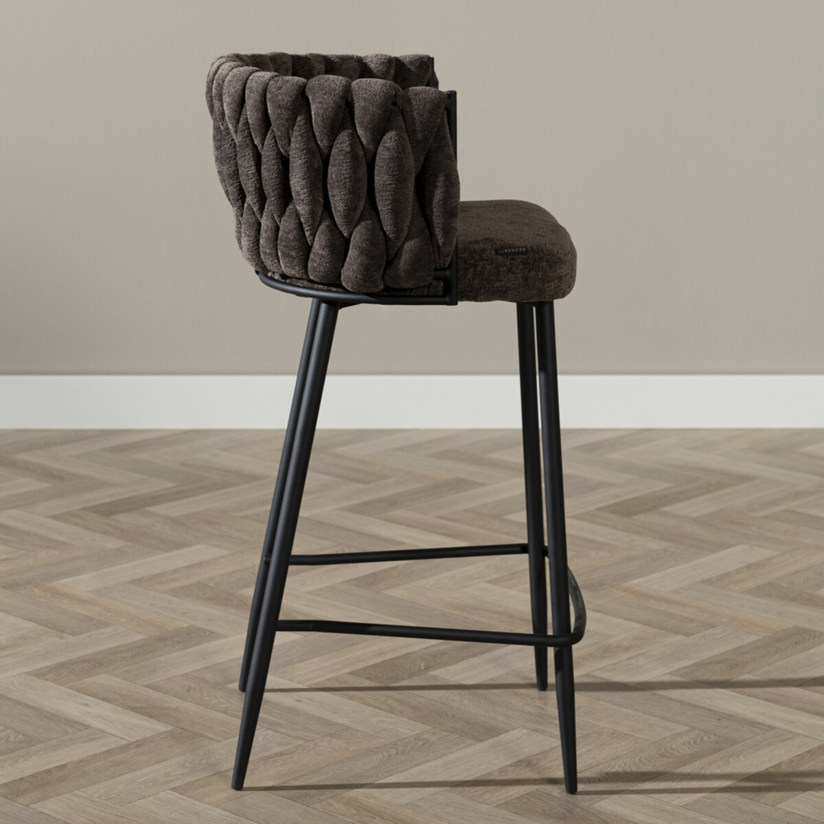 Die gemütliche Polsterung und der Bezug aus Chenille bieten besonders hohen Komfort. Chenille ist ein samtartiger Polyester Stoff, der aus kurzen und feinen Fäden hergestellt wird. Dadurch ist der Stoff nicht nur weich, sondern auch langlebig und robust. Zudem ist der Barhocker wasser- und schmutzabweisend, sodass er sehr pflegeleicht ist. Das Gestell ist aus einem mattschwarzen Metall gefertigt.