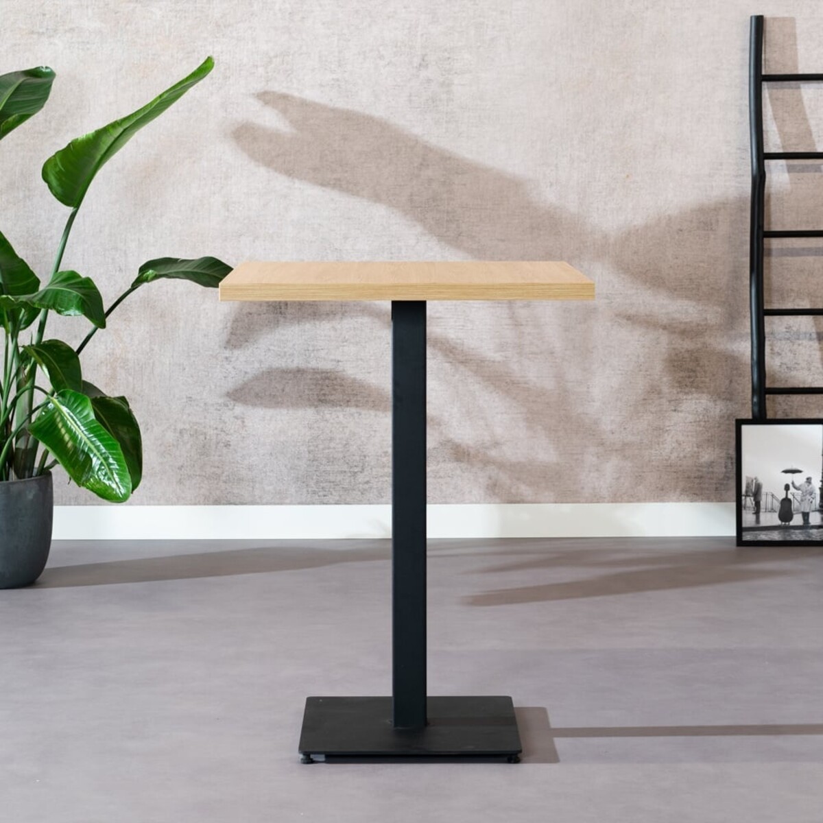 Das Gestell besteht aus schwarzem pulverbeschichtetem Metall. Der Fuß ist mittig angebracht und ist auf diese Weise kaum im Weg. Das Tischgestell ist etwas feiner. Auf diese Weise erhält der Bartisch eine luxuriöse Ausstrahlung.