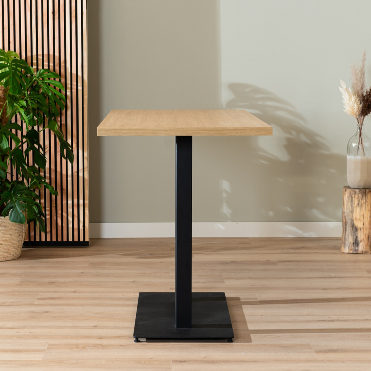 Das Gestell besteht aus schwarzem pulverbeschichtetem Metall. Der Fuß ist mittig angebracht und ist auf diese Weise kaum im Weg. Das Tischgestell ist etwas feiner. Auf diese Weise erhält der Bartisch eine luxuriöse Ausstrahlung.