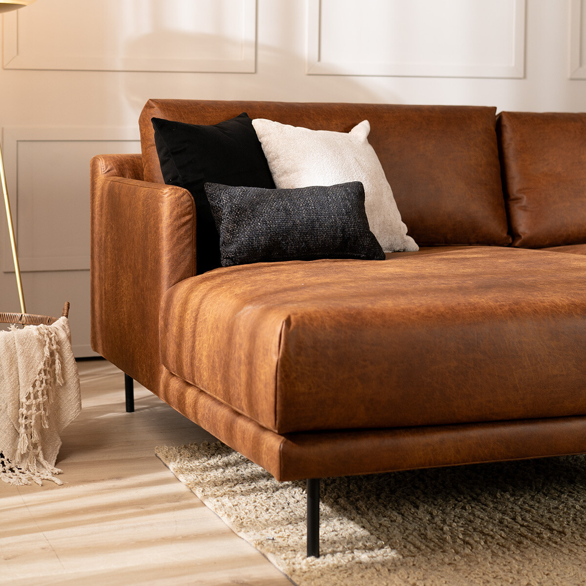 Das Ecksofa Denver hat dank der Kombination aus robustem Eco-Leder Essenza und schwarzen Metallfüßen einen industriellen Look. Das Sofa strahlt Charakter aus und passt perfekt in ein modernes, industrielles Interieur. Gleichzeitig bietet Denver durch die großzügigen Sitzkissen und den weichen Rückenkissen höchsten Komfort.