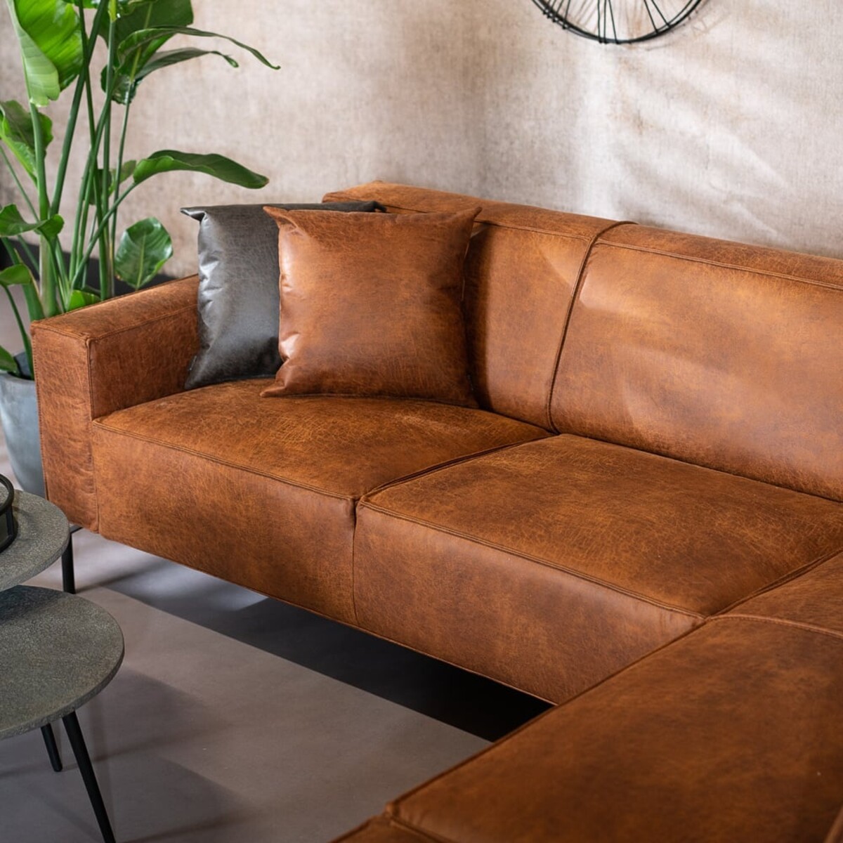 Eco-Leder besteht aus 70% recyceltem Leder und 30% Polyester. Dadurch fühlt es sich weicher und komfortabler an als 100%iges Leder und ist außerdem langlebig und strapazierfähig. Die Beine sind aus pulverbeschichtetem Metall und verleihen dem Sofa ein luftiges Aussehen.
