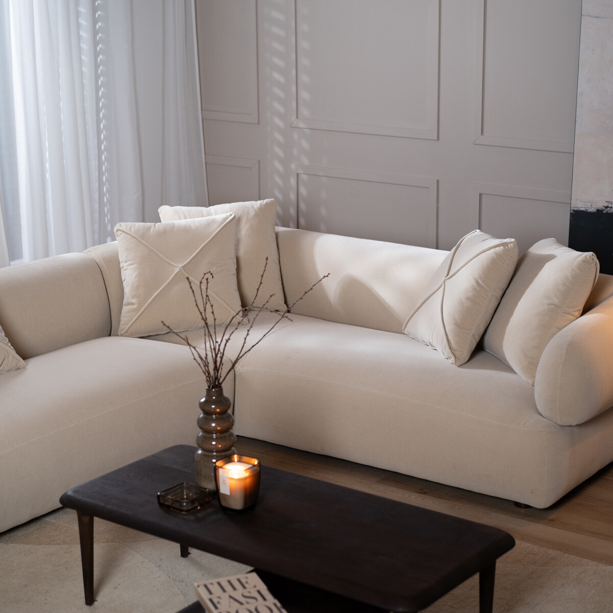 Die Kissen haben eine schicke Naht, die wie ein Kreuz aussieht und den Kissen einen besonderen Look verleiht. Jedoch kann das Kissen auch umgedreht werden, sodass du im Handumdrehen einen neuen Look ohne Kreuzmuster schaffst. Damit ist auch das Styling des Sofas erledigt, was dem Ganzen einen noch imposanteren Look verleiht. Somit kannst du dich auf dem Sofa nach einem anstrengenden Tag entspannen und deine Beine auf der breiten Ottomane ausstrecken. Du kannst aber auch einfach mit ein paar Freunden einen schönen Abend genießen. Das Sofa bietet nämlich Platz für etwa 4 bis 6 Personen.