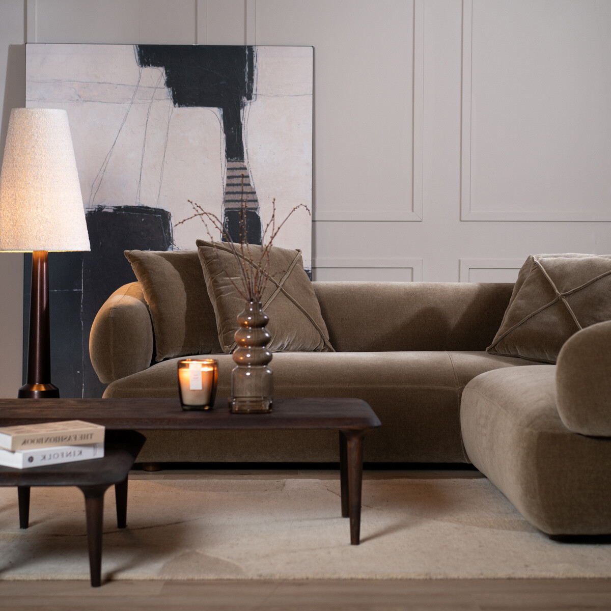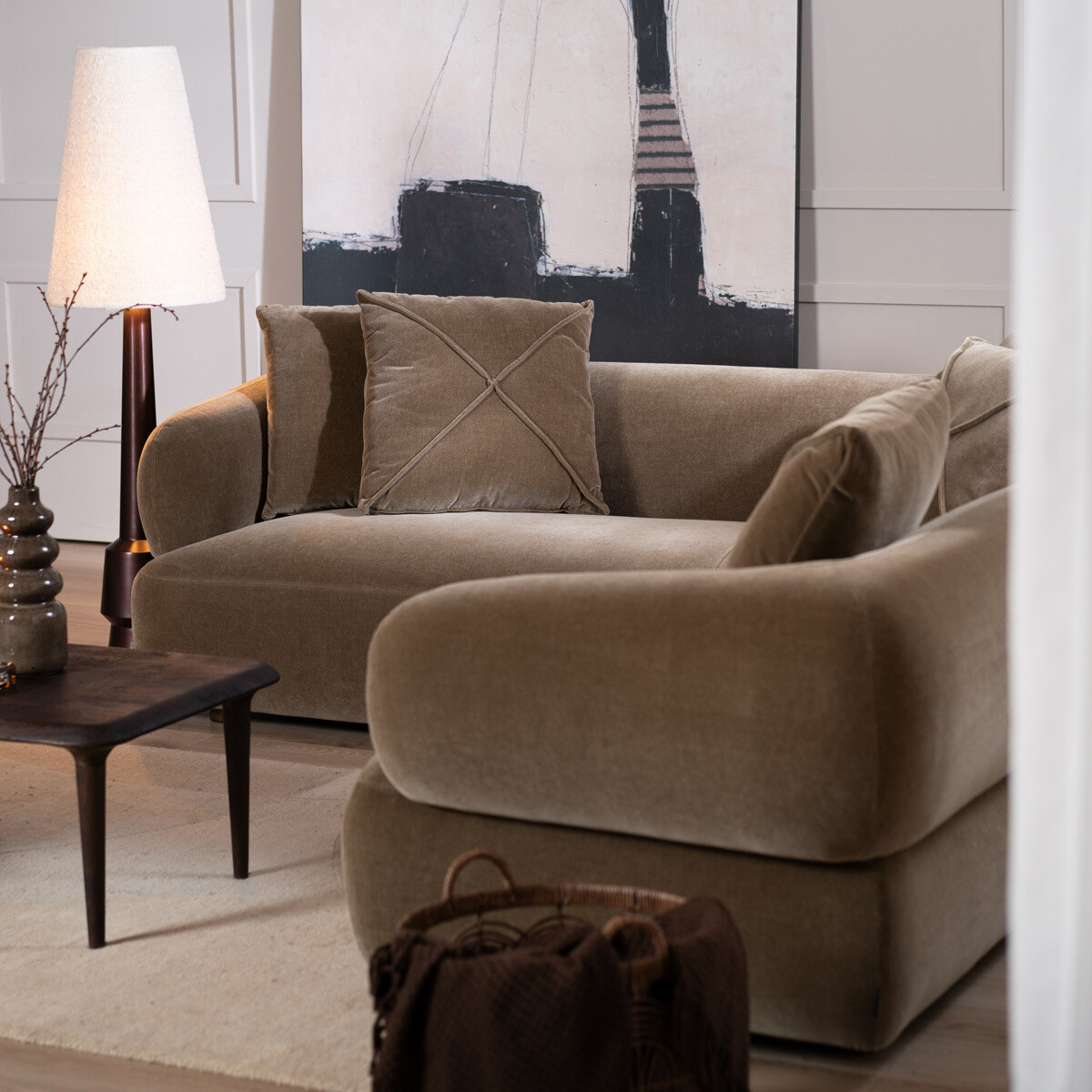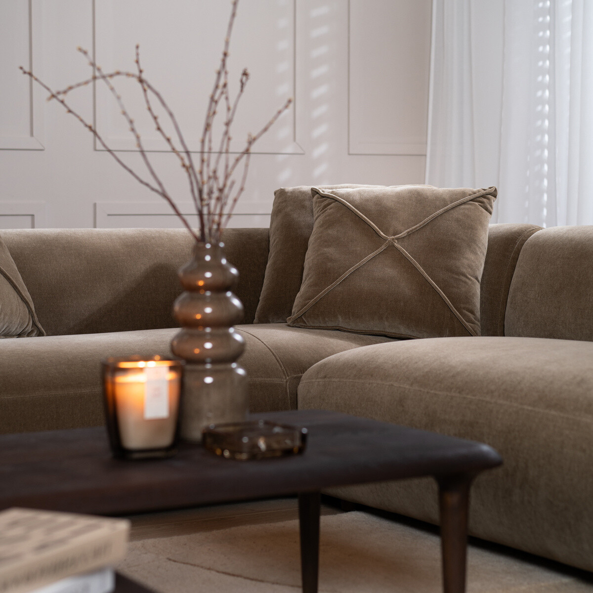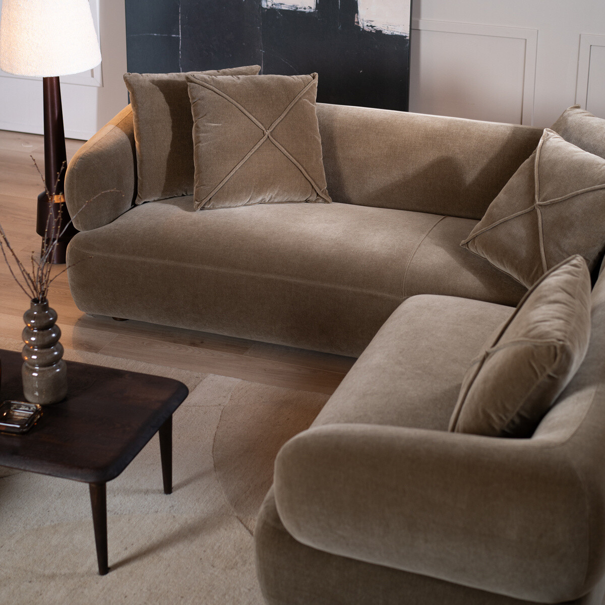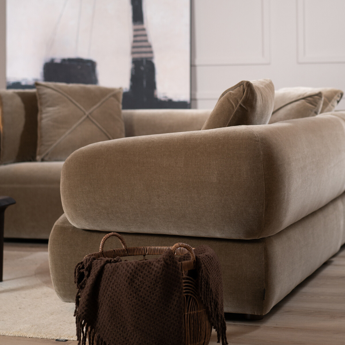 Das Ecksofa Palermo ist ein sehr komfortables Samtsofa und wird mit fünf Kissen geliefert. Das wasserabweisende Sofa überzeugt mit einer unglaublich gemütlichen Polsterung. Das Samtsofa ist dank der gepolsterten Armlehnen und den mitgelieferten Kissen im gleichen Stoff sehr komfortabel.