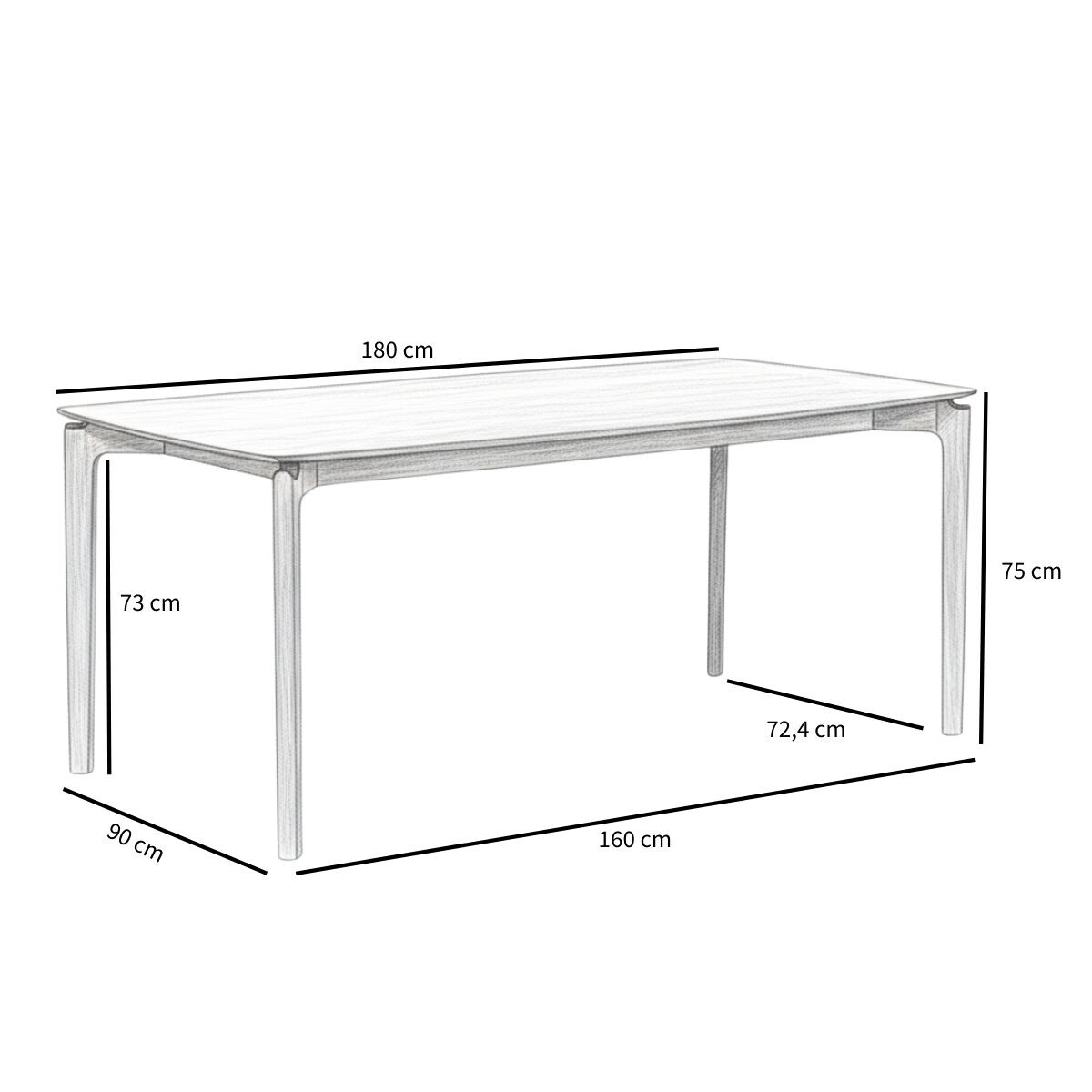 Die Höhe bis zur Unterkante der Tischplatte beträgt 73 cm, und der Esstisch bietet Platz für vier bis sechs Personen.