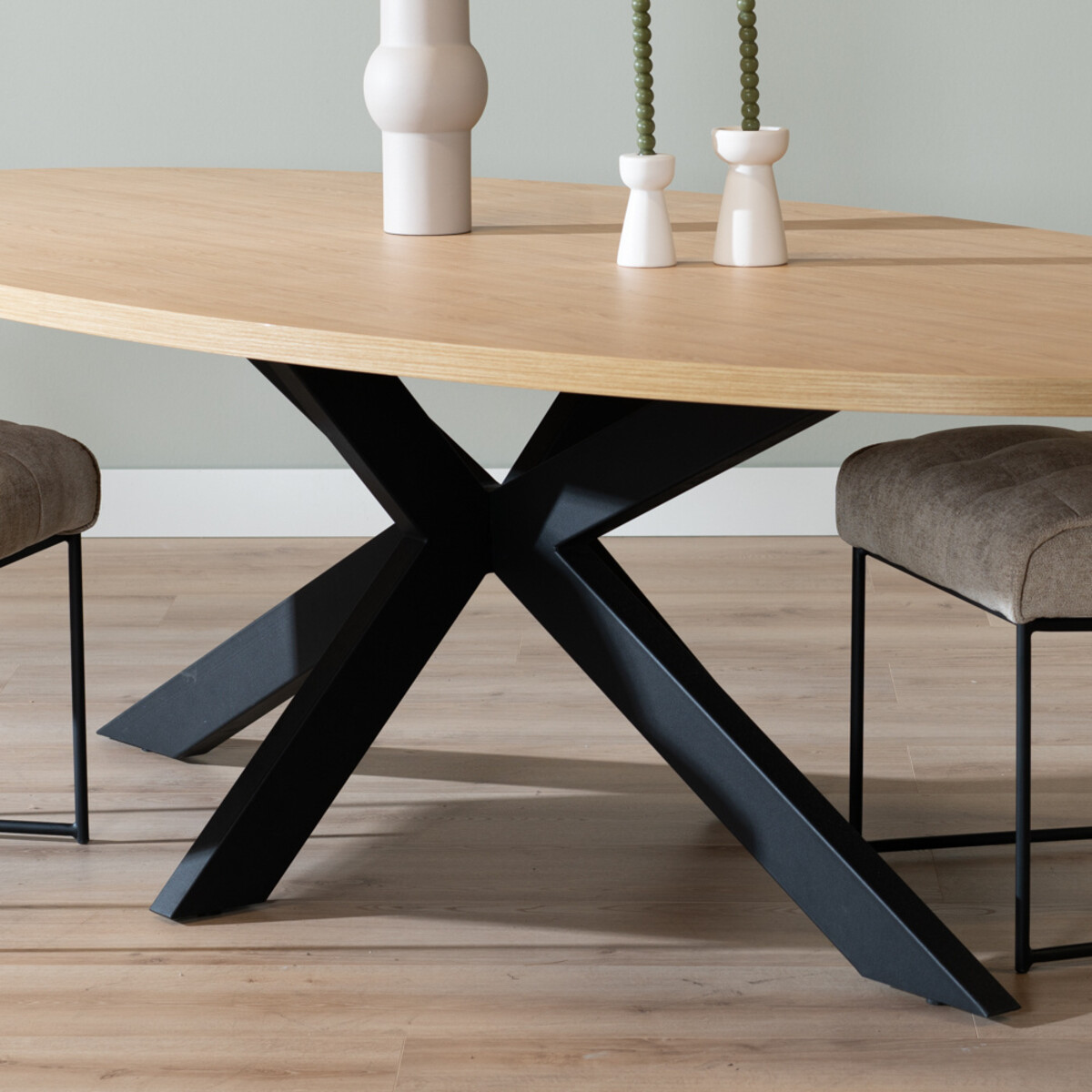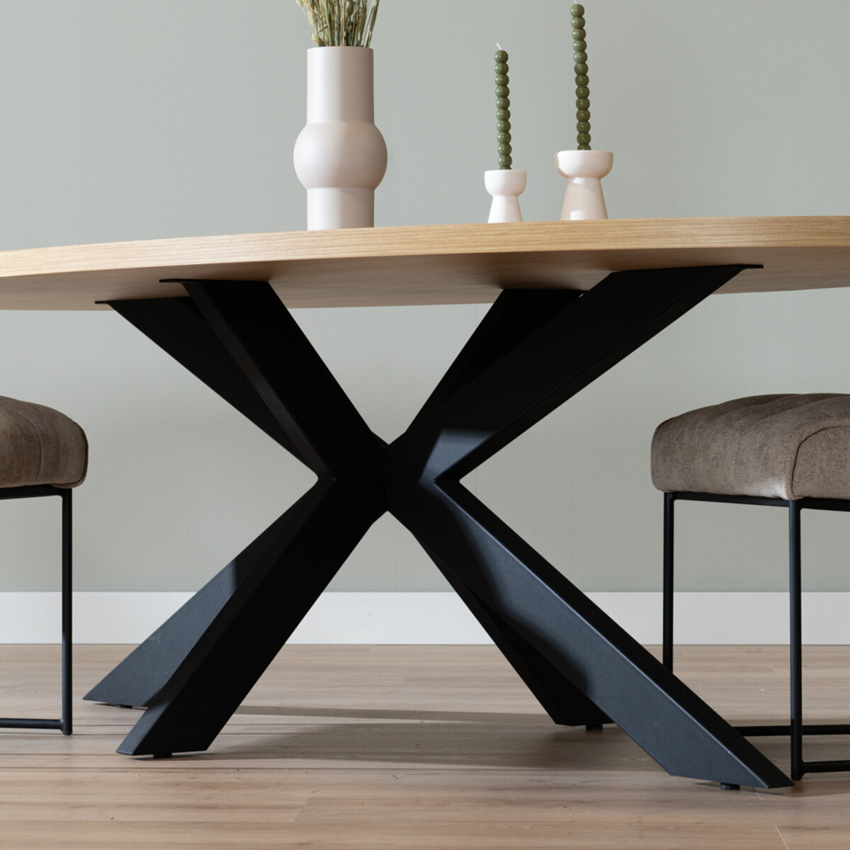 Das Gestell besteht aus schwarzem pulverbeschichtetem Metall und hat die sogenannte Spinnenform. Der Fuß ist mittig angebracht und ist auf diese Weise kaum im Weg. Die Metallbalken sind etwas feiner, auf diese Weise erhält der Tisch eine luxuriöse Ausstrahlung.