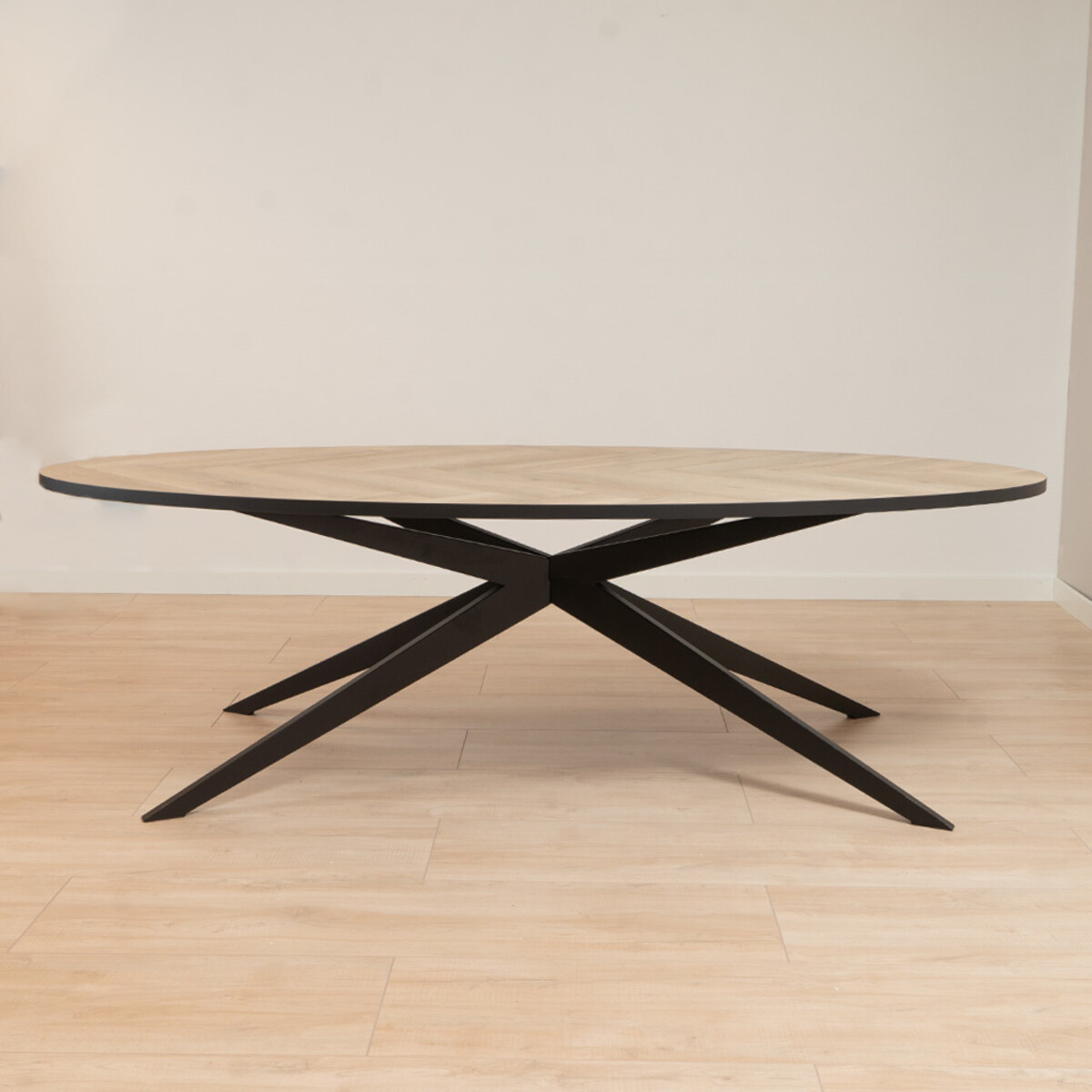 Der Esstisch Ilva ist oval und eignet sich somit perfekt für einen etwas schmaleren Raum. Die Tischplatte hat zudem ein Fischgrätmuster, dafür wurden einzelne Platten wie eine Fischgräte aneinander gelegt. Dieses Muster wird auch gerne für Böden genutzt und verleiht der Tischplatte das gewisse Etwas.