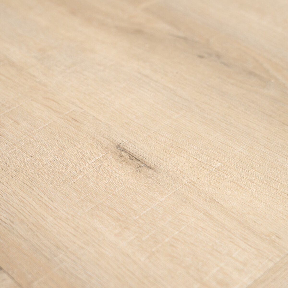 Die zweite Schicht ist die Folienschicht, diese bestimmt die Ausstrahlung der Tischplatte. Die Tischplatte hat einen hellen Eichen-Look und passt somit perfekt in den skandinavischen Einrichtungsstil. Nach der Folienschicht wird die Deckschicht hinzugefügt. Die oberste Schicht sorgt dafür, dass das Produkt bestmöglich vor Verschleiß geschützt ist und macht diese kratzbeständig, allerdings nicht kratzfest. Außerdem entsteht eine holzartige Struktur durch die Deckschicht, Maserungen wurden eingearbeitet. Die Platte ist nicht von echtem Holz zu unterscheiden.