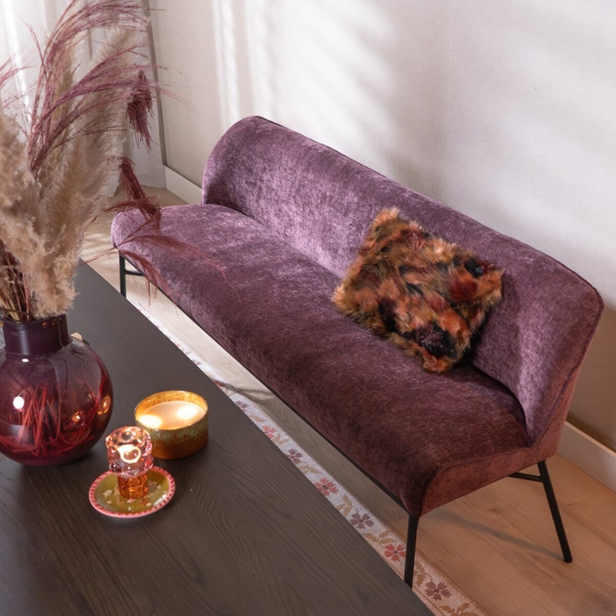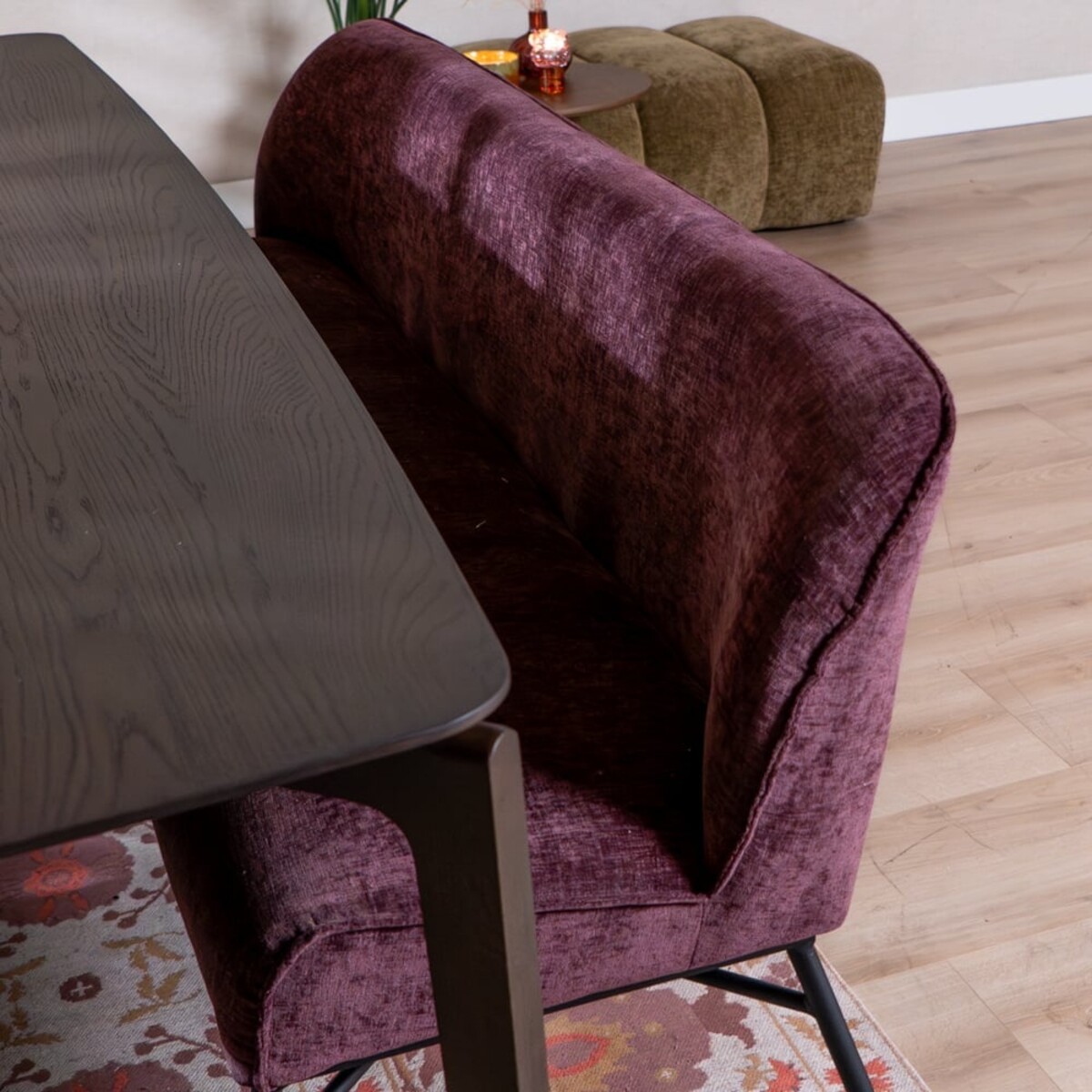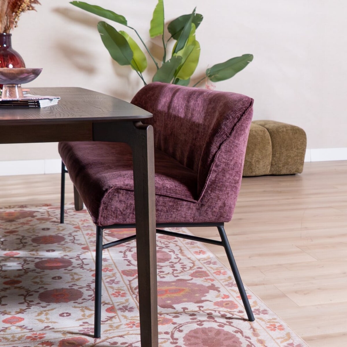 Lerne die Esszimmerbank Momo Chenille Lila 155 cm kennen. Diese Bank fällt durch ihre auffällige Farbe auf und bietet bequem Platz für 2 bis 3 Personen. Durch das einzigartige Design und den hochwertigen Chenille-Stoff ist sie ein echter Blickfang in deinem Interieur und besonders geeignet für alle, die Funktionalität und Stil verbinden möchten. Miss den Abstand zwischen den Tischbeinen sorgfältig, damit die Bank sicher dazwischen passt.