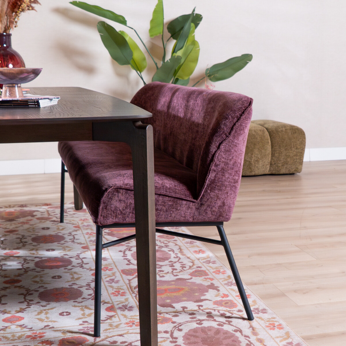 Lerne die Esszimmerbank Momo Chenille Lila 185 cm kennen. Diese Bank fällt durch ihre auffällige Farbe auf und bietet bequem Platz für 3 bis 4 Personen. Durch das einzigartige Design und den hochwertigen Chenille-Stoff ist sie ein echter Blickfang in deinem Interieur und besonders geeignet für alle, die Funktionalität und Stil verbinden möchten. Miss den Abstand zwischen den Tischbeinen sorgfältig, damit die Bank sicher dazwischen passt.
