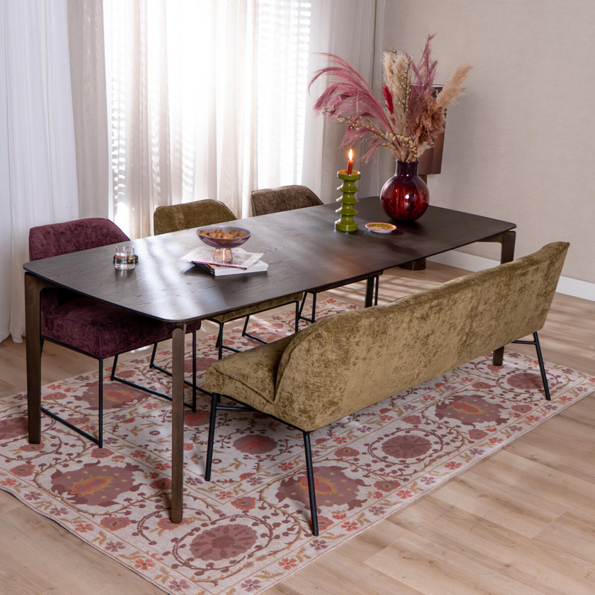 Die Momo Essbank passt perfekt in verschiedene Einrichtungsstile. Der olivgrüne Chenille-Stoff sorgt für eine warme und ansprechende Optik, während die stabile Nosag-Federung im Sitz langanhaltenden Komfort garantiert. Kombinieren Sie die Bank einfach mit den Momo Hockern oder Stühlen, um ein stimmiges Gesamtbild am Esstisch zu schaffen. Messen Sie den Abstand zwischen den Tischbeinen genau, um sicherzustellen, dass die Bank passt.