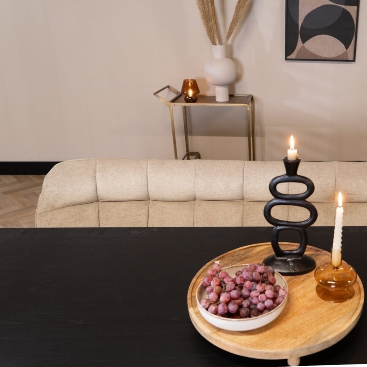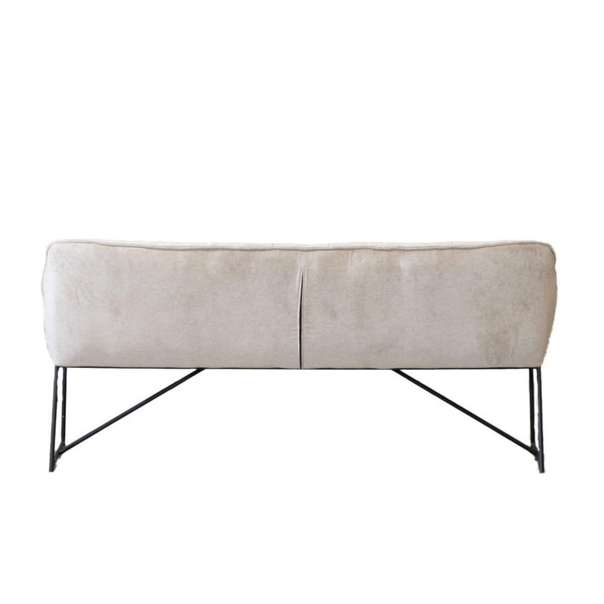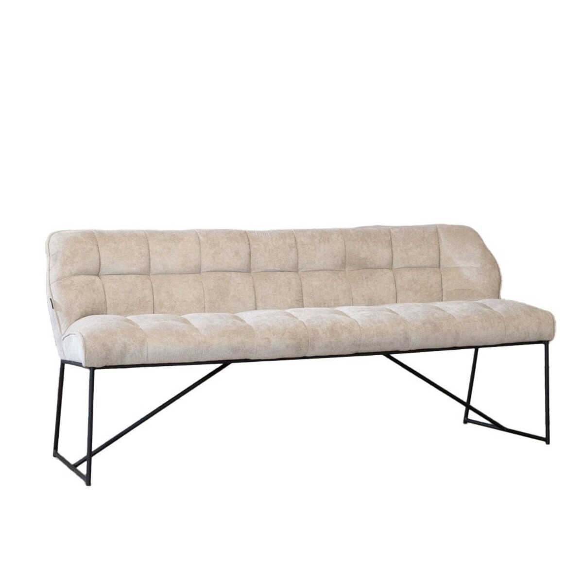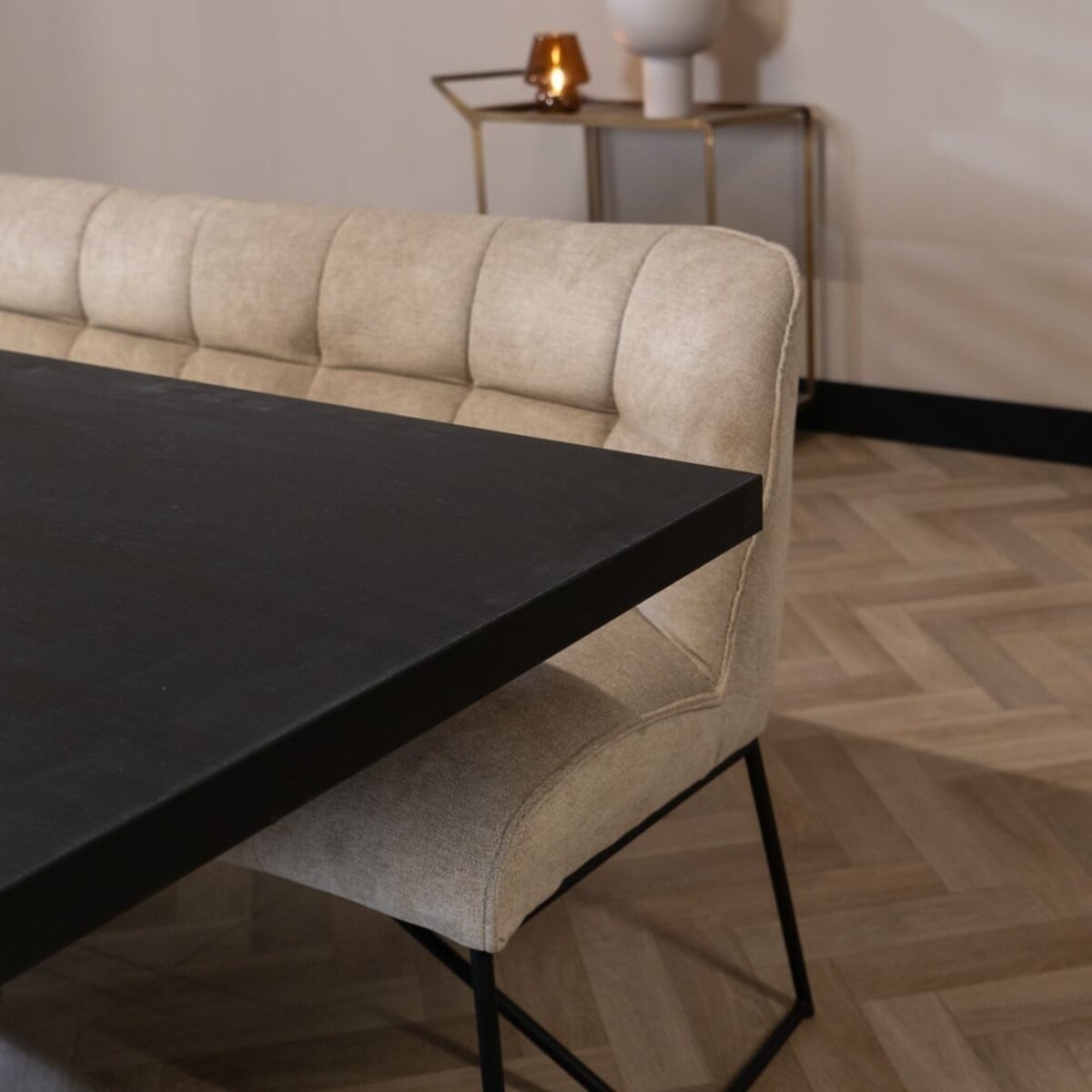 Die Sitzbank Jelle wurde aus meliertem Polyesterstoff gefertigt. Der Stoff Highline ist wasserabweisend. Wenn hier mal etwas daneben gehen sollte, ist das gar kein Problem. Der Fleck lässt sich einfach abtupfen. Dadurch eignet sich die Bank auch ideal für einen Haushalt mit Kindern. Der Stoff ist mit einem Martindale-Score von 100.000 sehr verschleißfest und bleibt somit lange in einem sehr guten Zustand. Somit wirst du lange Freude an deiner Sitzbank fürs Esszimmer haben. Die Esszimmerbank mit Lehne hat ein schwarzes, pulverbeschichtetes Metallgestell. Dies verleiht ihm einen luxuriösen und dennoch robusten Look. Außerdem hat der Sitz an der Rückenlehne ein Rautenmuster eingestickt. Die Bank ist 220 cm lang, sodass du sie im Essbereich gut mit passenden Stühlen kombinieren kannst.
