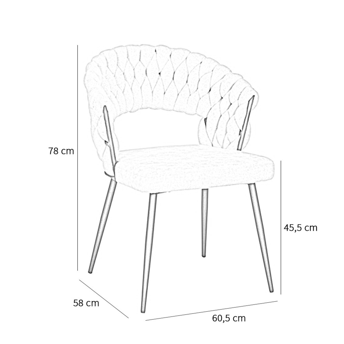 Der Esszimmerstuhl Braid ist aus einem wasserabweisenden Chenillestoff gefertigt und überzeugt mit einer schicken Rautennaht in der Rückenlehne. Dadurch sieht es wie ein Flechtmuster aus. Die gepolsterte Rückenlehne ist offen, sodass Krümel sich nicht auf der Sitzfläche sammeln. Zudem hat der gemusterte Esszimmerstuhl Armlehnen, sodass er viel Halt bietet. Egal, ob du den Armlehnstuhl Braid als Küchenstuhl oder als Blickfang im Wohnzimmer nutzt - der praktische Esszimmerstuhl mit Lehne ist vielseitig einsetzbar und in jedem Fall ein schicker Blickfang in deinem Interieur!