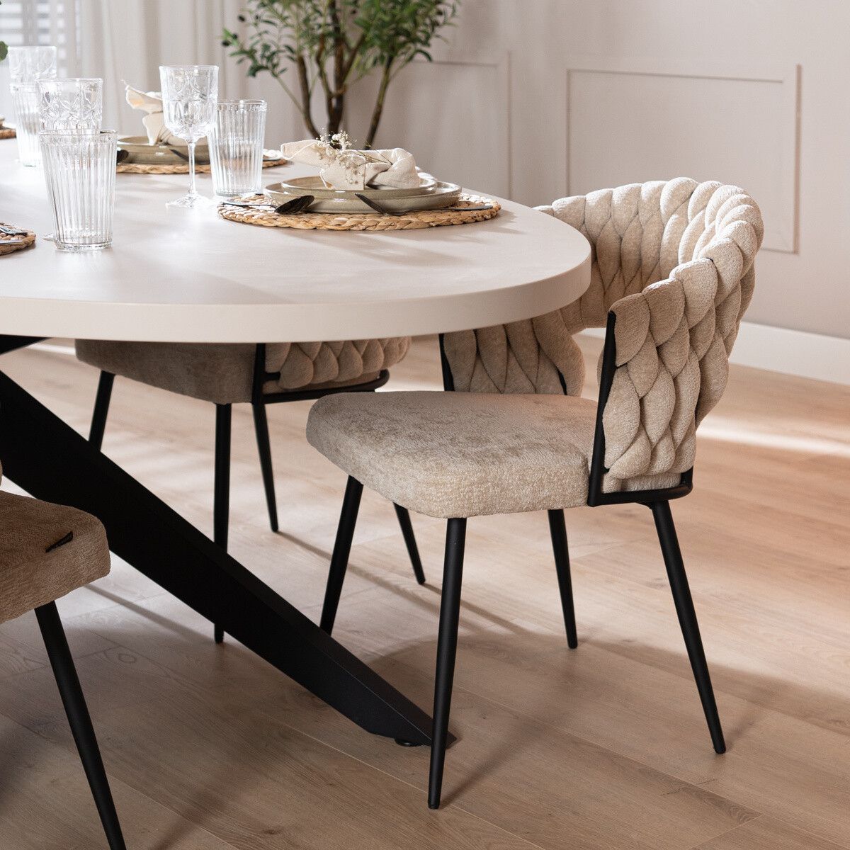 Die gemütliche Polsterung und der Bezug aus Chenille bieten besonders hohen Komfort. Chenille ist ein samtartiger Polyester Stoff, der aus kurzen und feinen Fäden hergestellt wird. Dadurch ist der Stoff nicht nur weich, sondern auch langlebig und robust. Zudem ist der Stuhl wasser- und schmutzabweisend, sodass er sehr pflegeleicht ist. Das Gestell ist aus einem mattschwarzen Metall gefertigt.