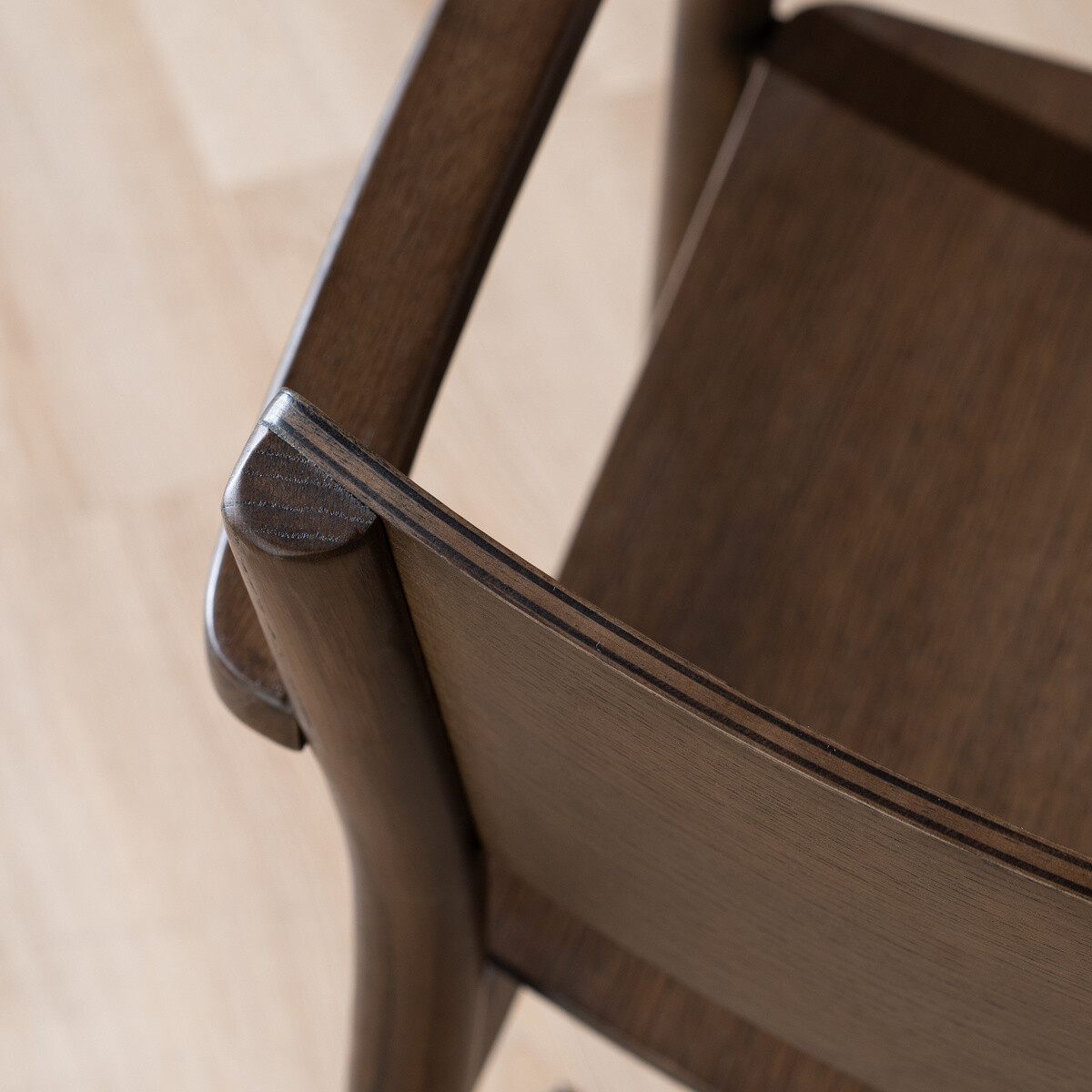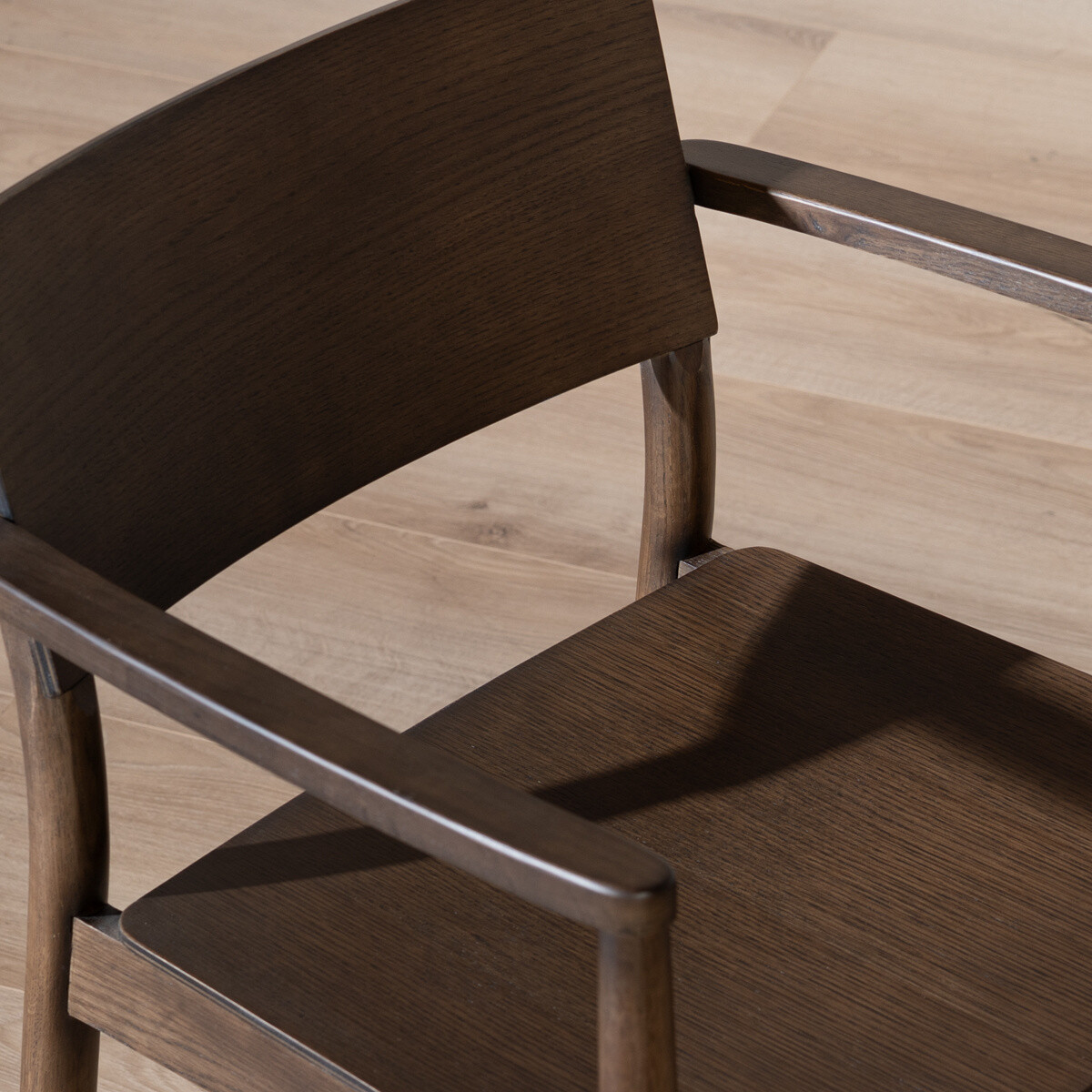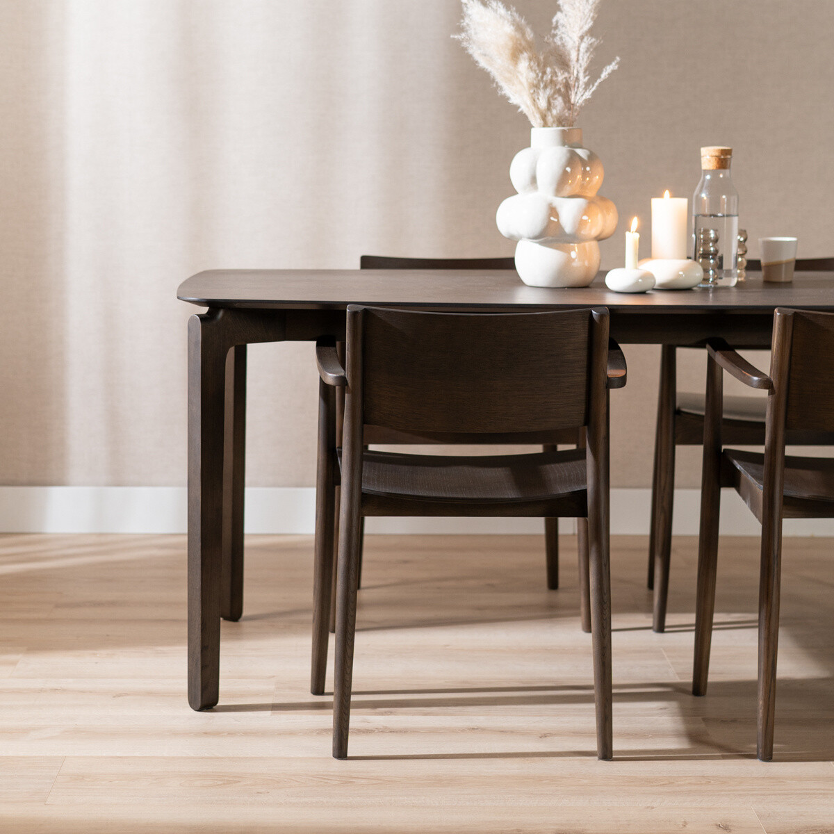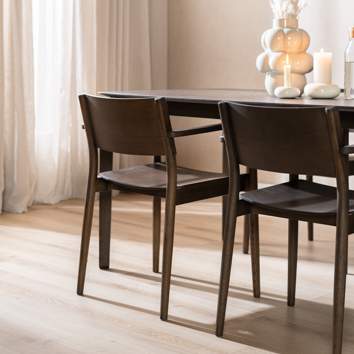 Die Sitzfläche und Rückenlehne bestehen aus Multiplex mit einer Schicht Eichenfurnier. Eichenfurnier strahlt Wärme aus und ist langlebig, jedoch empfindlich gegenüber Kratzern und Dellen. Daher ist es wichtig, den Esszimmerstuhl gut zu schützen. Zudem sollte das Möbelstück nicht direktem Sonnenlicht ausgesetzt werden, da sich die Farbe des Furniers mit der Zeit verändern kann.Das Gestell des Stuhls ist aus 100 % massivem Eichenholz gefertigt. Massivholz ist stabil und robust, wodurch der Stuhl eine hohe Langlebigkeit aufweist.