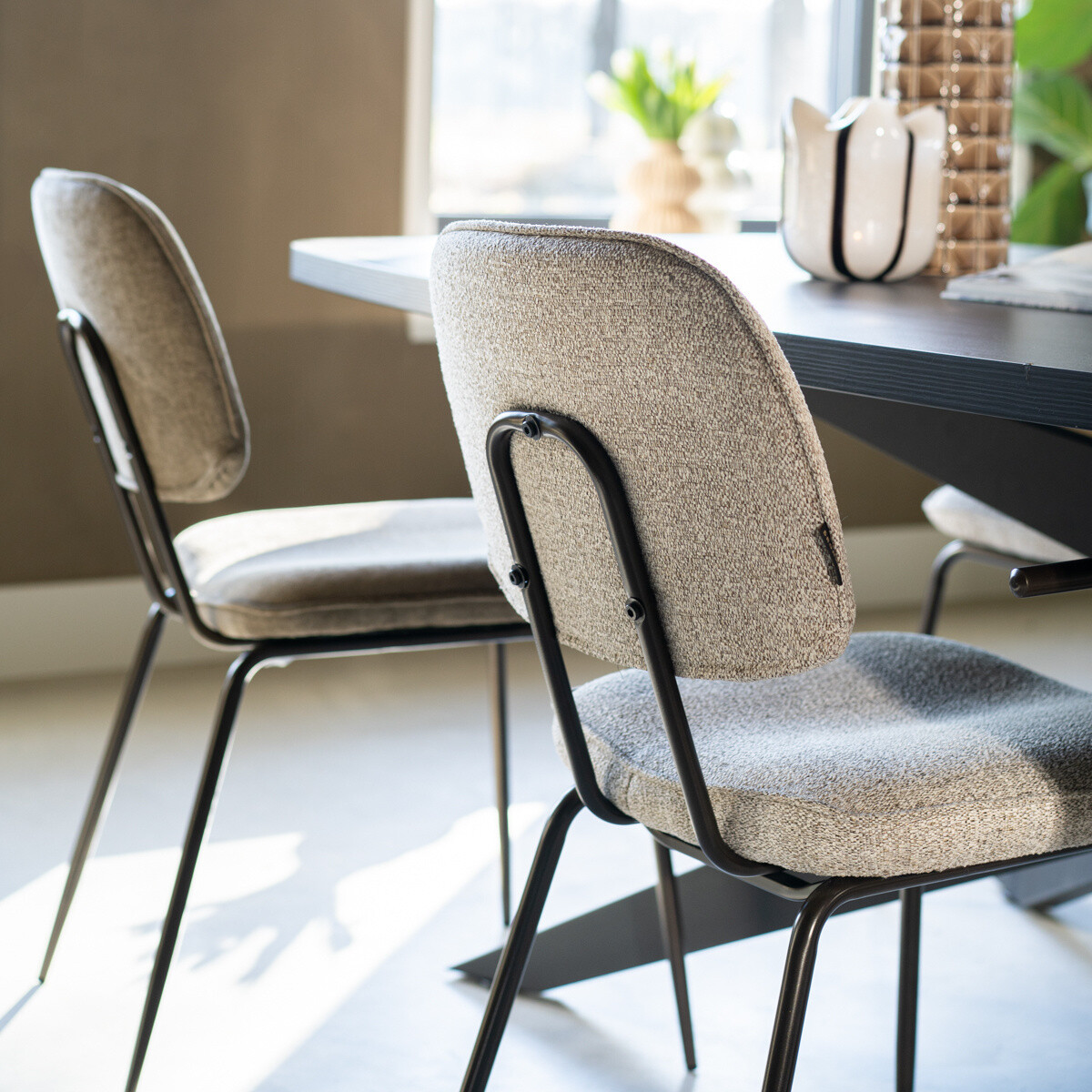 Der Esszimmerstuhl Jethro ist der perfekte Stuhl, wenn du ein minimalistisches Design suchst, aber auch bequem sitzen möchtest. Durch das dunkelbraune Stahlgestell in Kombination mit dem melierten Stoff hat der Stuhl eine exklusive, stilvolle Ausstrahlung, die perfekt zum trendigen Urban-Loft-Stil passt. Der Stuhl hat einen industriellen Charakter, aber die Kombination aus dem weichen Stoff mit dezentem Glanz und dem dunkelbraunen Gestell macht ihn zu einem echten Hingucker am Esstisch.