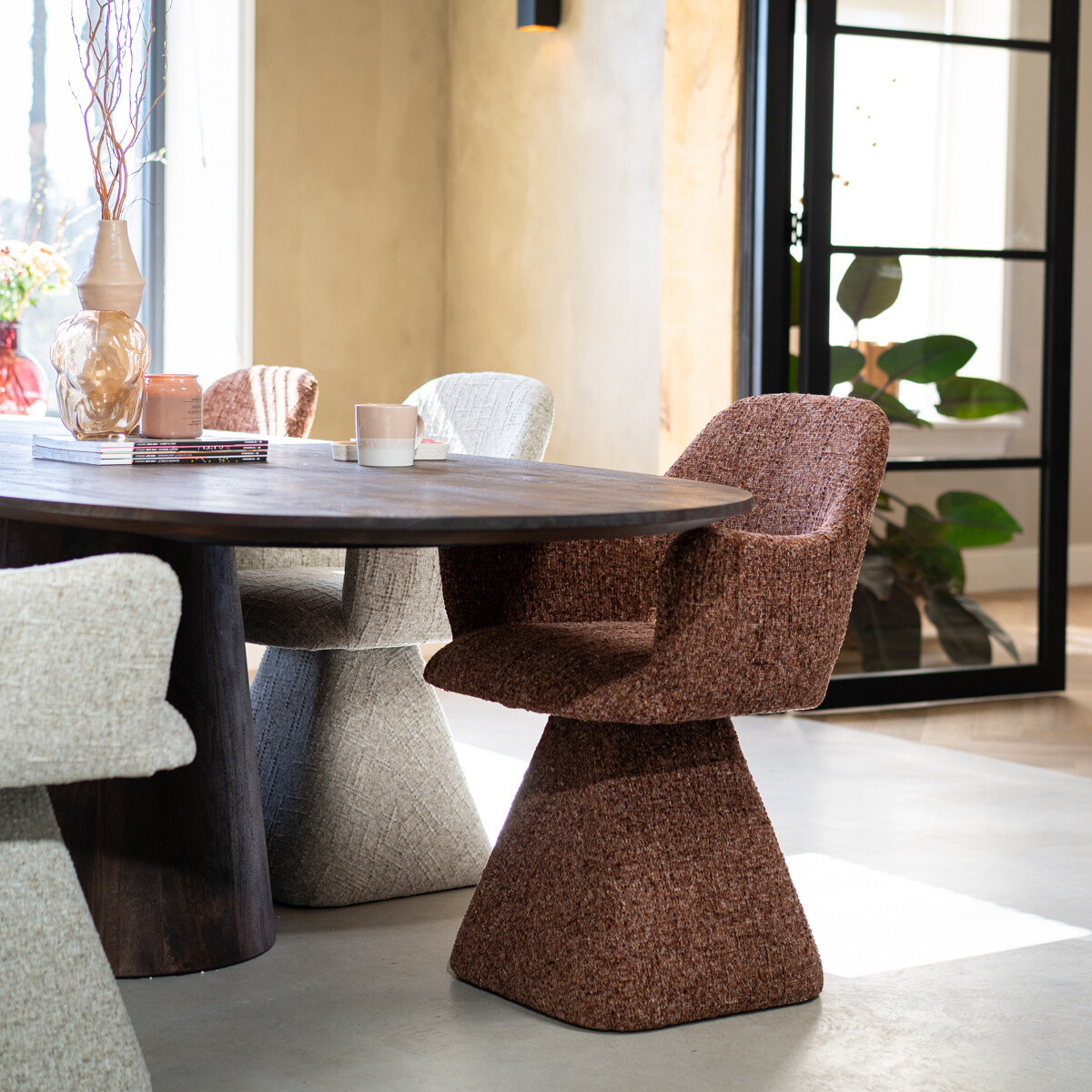 Der Stuhl ist mit dem Stoff Cestino bezogen. Dieser Stoff ist eine vielseitige und langlebige Wahl, bestehend aus 95% Polyester und 5% Baumwolle, was eine perfekte Balance zwischen Festigkeit und Weichheit bietet. Der Stoff ist wasserabweisend und daher leicht zu reinigen. Das Besondere am Josh-Stuhl ist, dass der Fuß gepolstert ist, wodurch der Stuhl in jedem Interieur zu einem Statement wird.