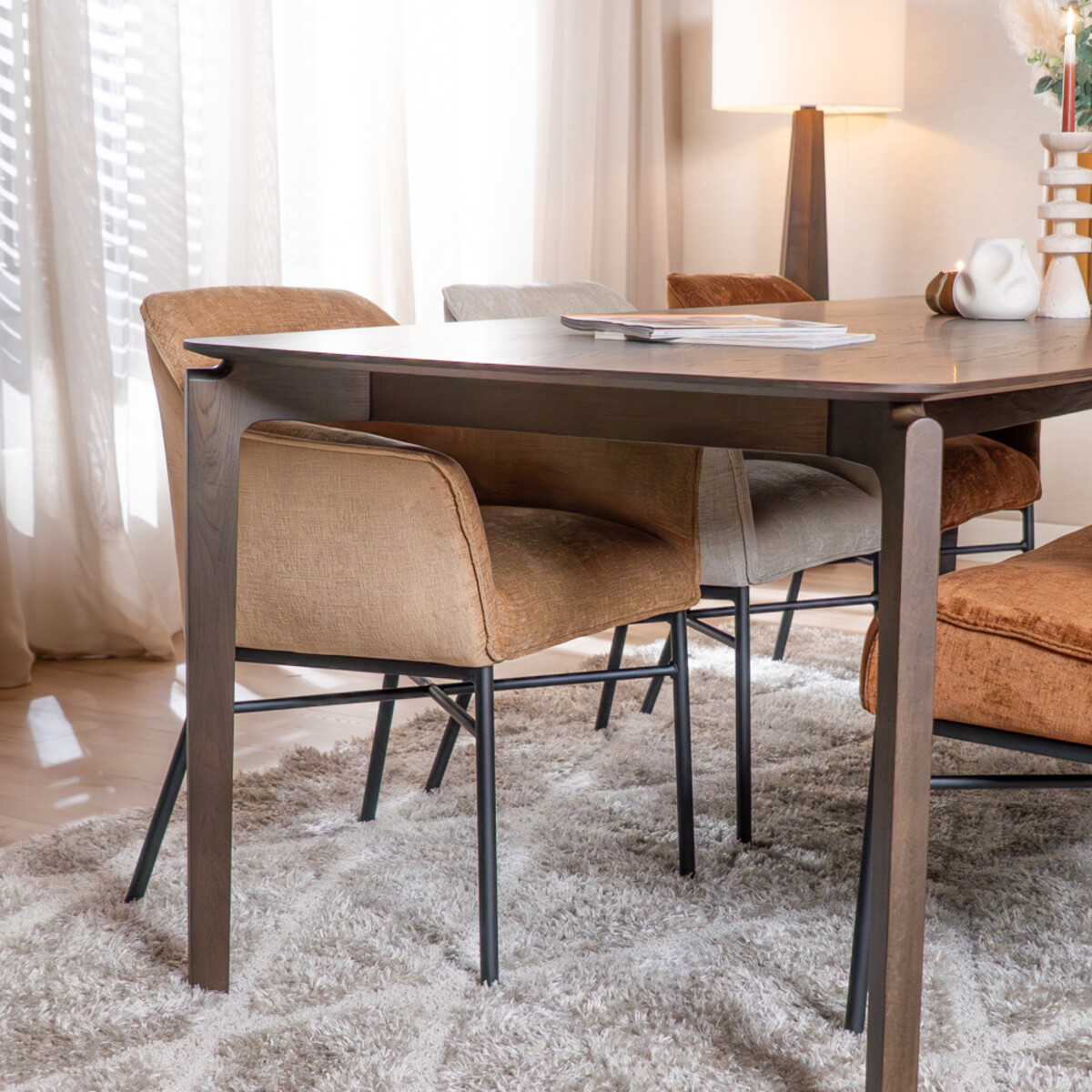 Dieser Stuhl verfügt über ein extra verstärktes Metallgestell und eine Sitzfläche mit Nosag-Federung, was für optimalen Sitzkomfort sorgt. Der wasserabweisende Chenille-Stoff ist strapazierfähig und lässt sich einfach mit einem feuchten Tuch reinigen. Die reich gepolsterten Armlehnen und die hochwertige Verarbeitung sorgen dafür, dass der Nubo sofort eine angenehme Atmosphäre im Esszimmer schafft.