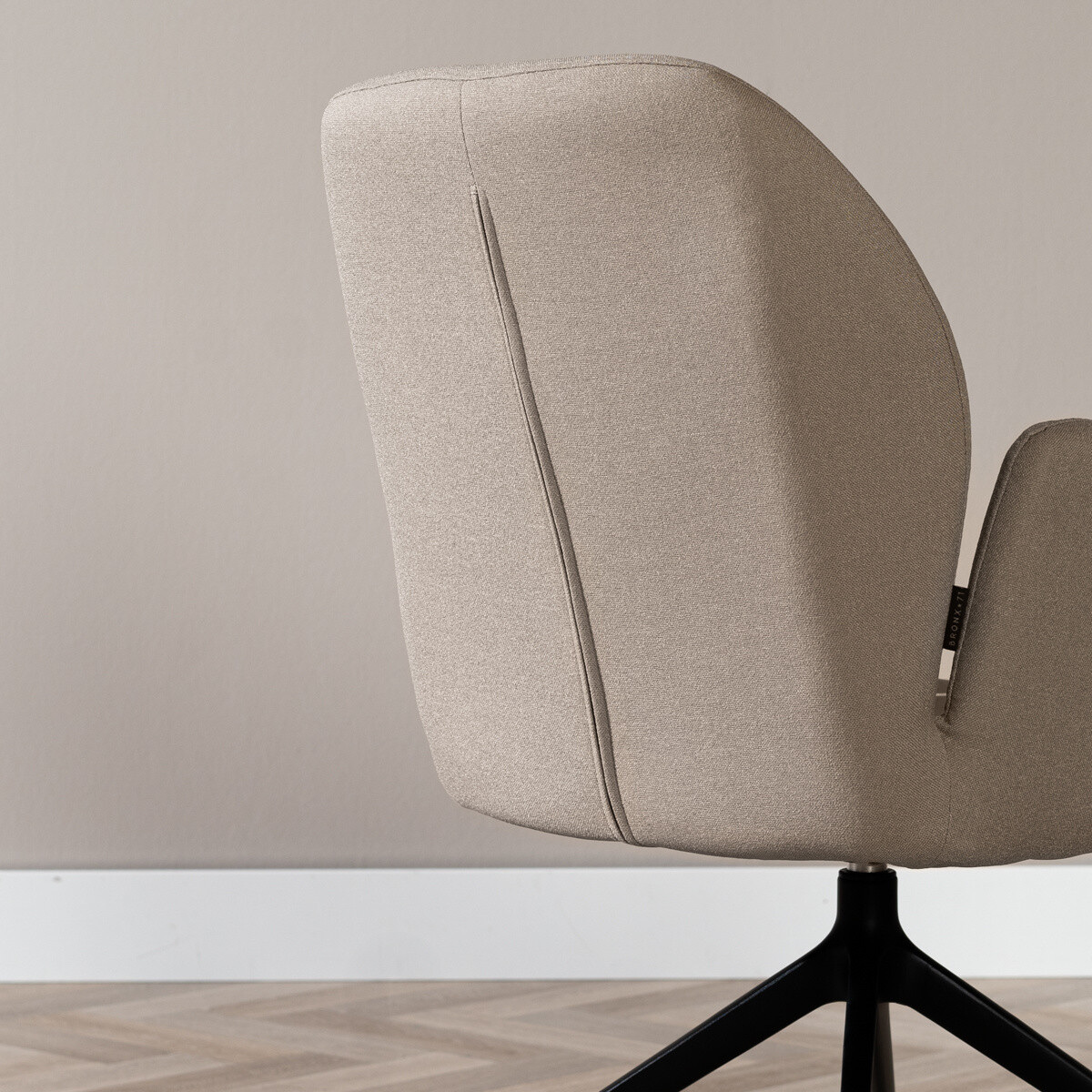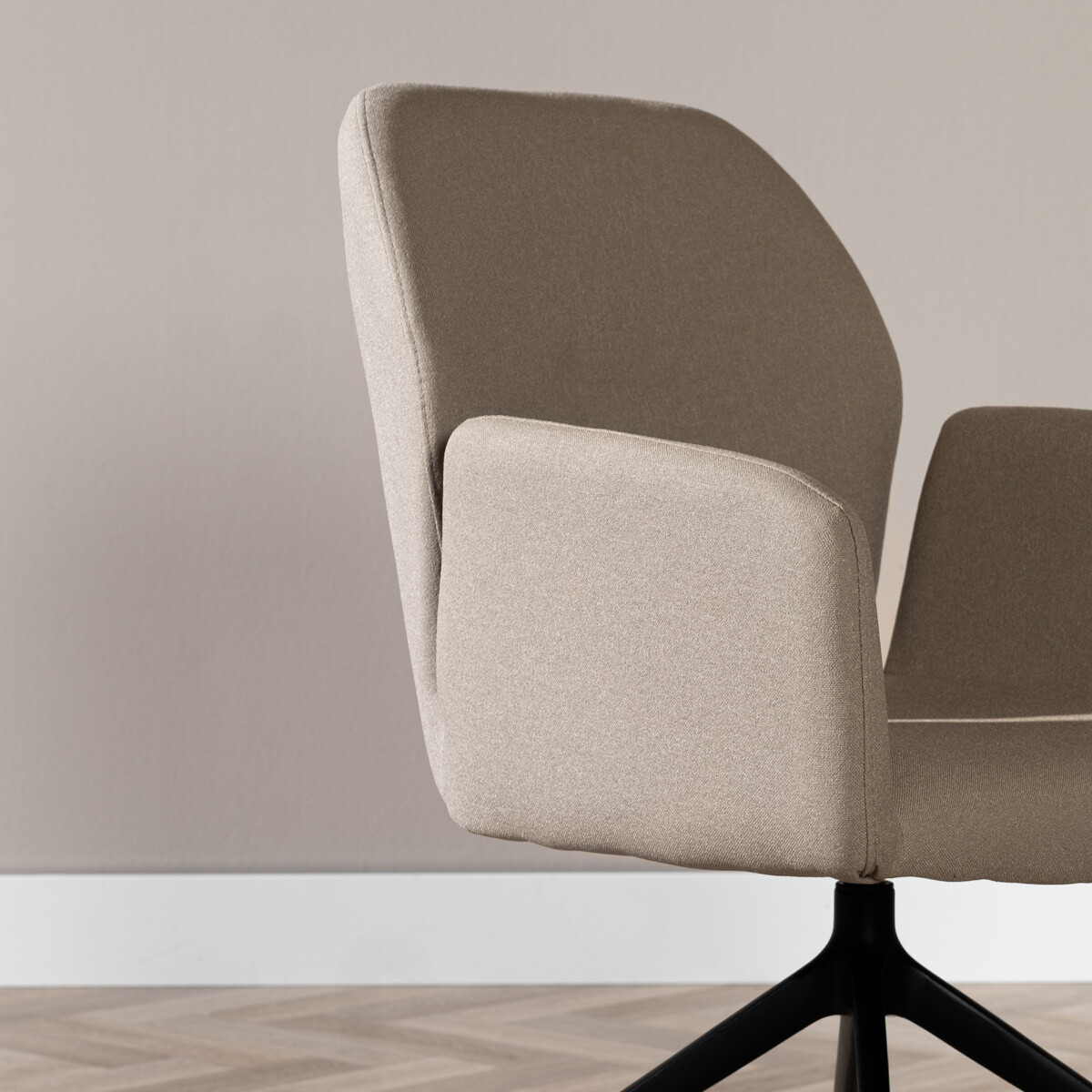 Der skandinavische Esszimmerstuhl Runa hat eine hohe Rückenlehne und bietet somit ein hohes Maß an Sitzkomfort, auch ideal für Menschen mit einer Körpergröße über 1,80m. Die Armlehnen sind nicht an der Rückenlehne befestigt und verleihen dem Stuhl damit viel Leichtigkeit. Der Armlehnstuhl wurde aus 100% recyceltem Stoff gefertigt. Der Hygge Stoff ist ein Polyesterstoff, welcher aus Plastikflaschen besteht und damit sehr nachhaltig ist. Der Stoff ist genauso robust, widerstandsfähig und langlebig wie normales Polyester. Darüber hinaus ist der Stoff wasserabweisend, was im Esszimmer und in einem Haushalt mit Kindern einfach ideal ist. Mit einem Martindale Score von 50.000 ist der Hygge Stoff zudem sehr verschleißfest. Reinigen kann man ihn mit einem feuchten Tuch und Wasser. Das Gestell des Armlehnstuhls wurde aus schwarzem pulverbeschichteten Metall gefertigt und besteht aus vier Beinen, welche von Innen nach Außen verlaufen, zudem wurden Rollen angebracht. Die außergewöhnliche Form wird auch gerne Spinnenfuß genannt.