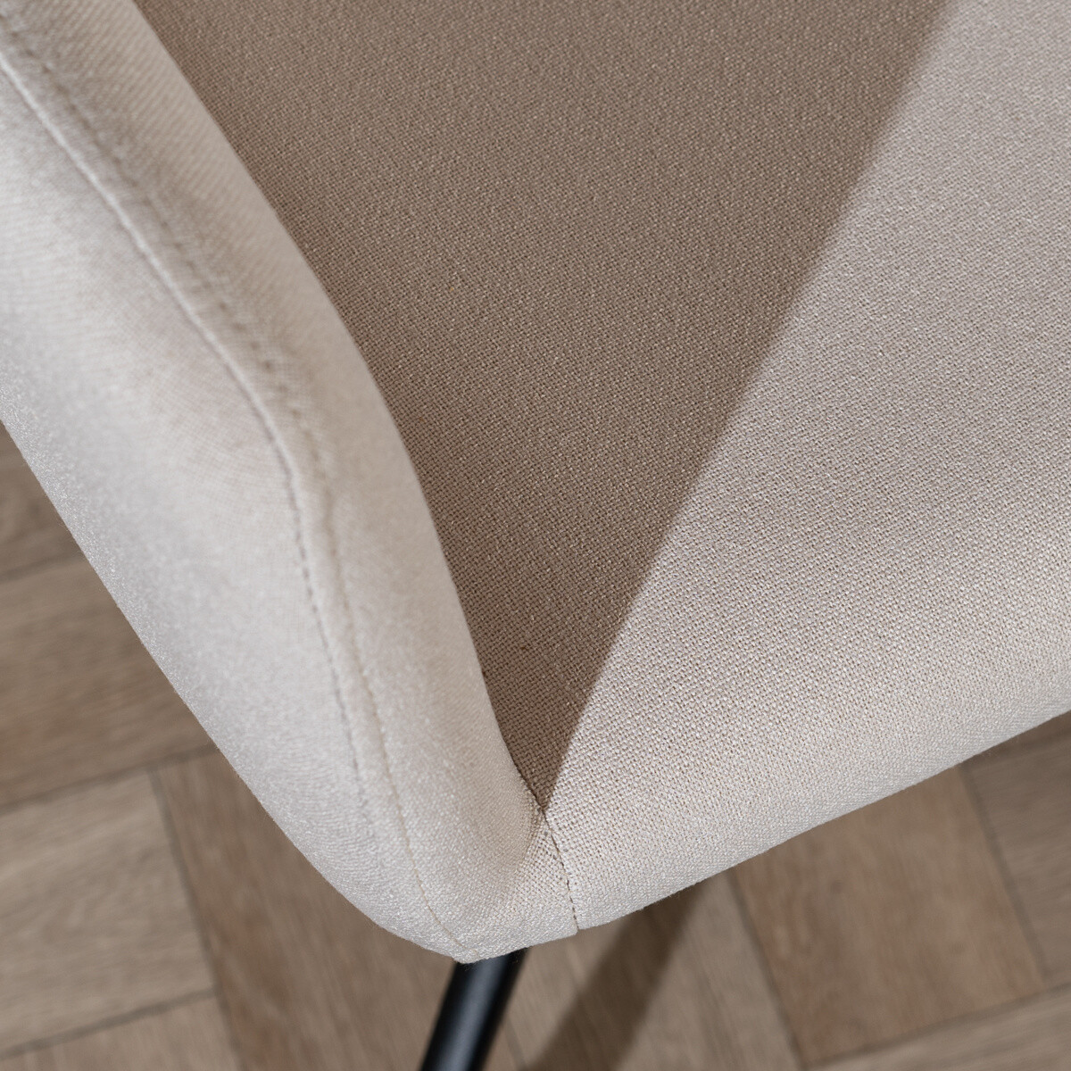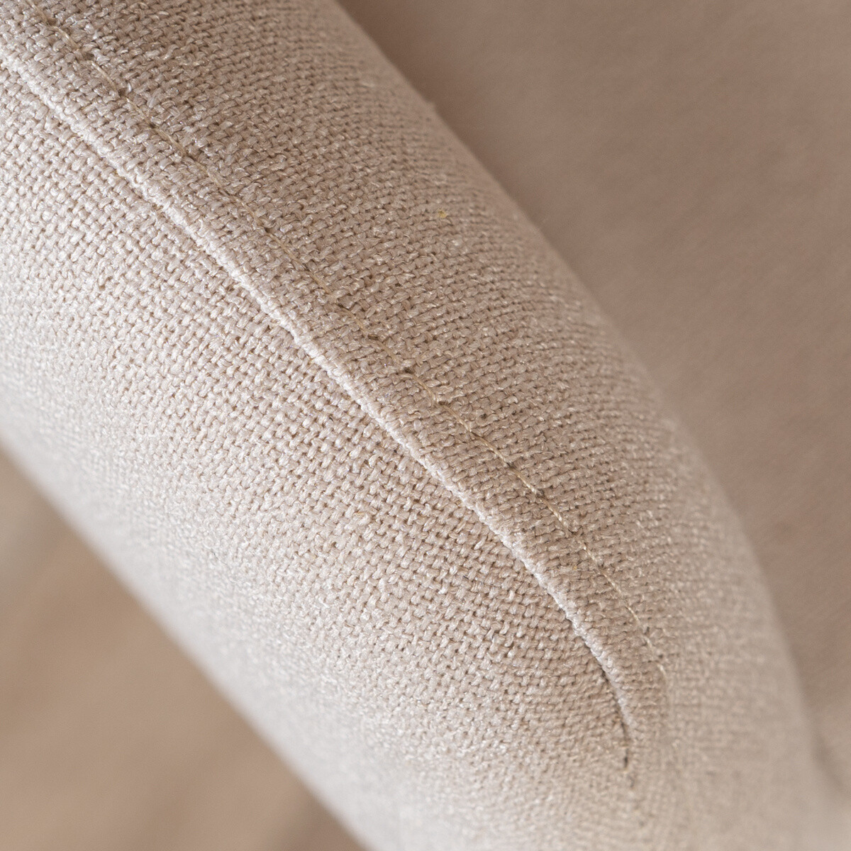 Der skandinavische Esszimmerstuhl Runa hat eine hohe Rückenlehne und bietet somit ein hohes Maß an Sitzkomfort, auch ideal für Menschen mit einer Körpergröße über 1,80m. Die Armlehnen sind nicht an der Rückenlehne befestigt und verleihen dem Stuhl damit viel Leichtigkeit. Der Armlehnstuhl wurde aus 100% recyceltem Stoff gefertigt. Der Hygge Stoff ist ein Polyesterstoff, welcher aus Plastikflaschen besteht und damit sehr nachhaltig ist. Der Stoff ist genauso robust, widerstandsfähig und langlebig wie normales Polyester. Darüber hinaus ist der Stoff wasserabweisend, was im Esszimmer und in einem Haushalt mit Kindern einfach ideal ist. Mit einem Martindale Score von 50.000 ist der Hygge Stoff zudem sehr verschleißfest. Reinigen kann man ihn mit einem feuchten Tuch und Wasser. Das Gestell des Armlehnstuhls wurde aus schwarzem pulverbeschichteten Metall gefertigt und besteht aus vier Beinen, welche von Innen nach Außen verlaufen, zudem wurden Rollen angebracht. Die außergewöhnliche Form wird auch gerne Spinnenfuß genannt.