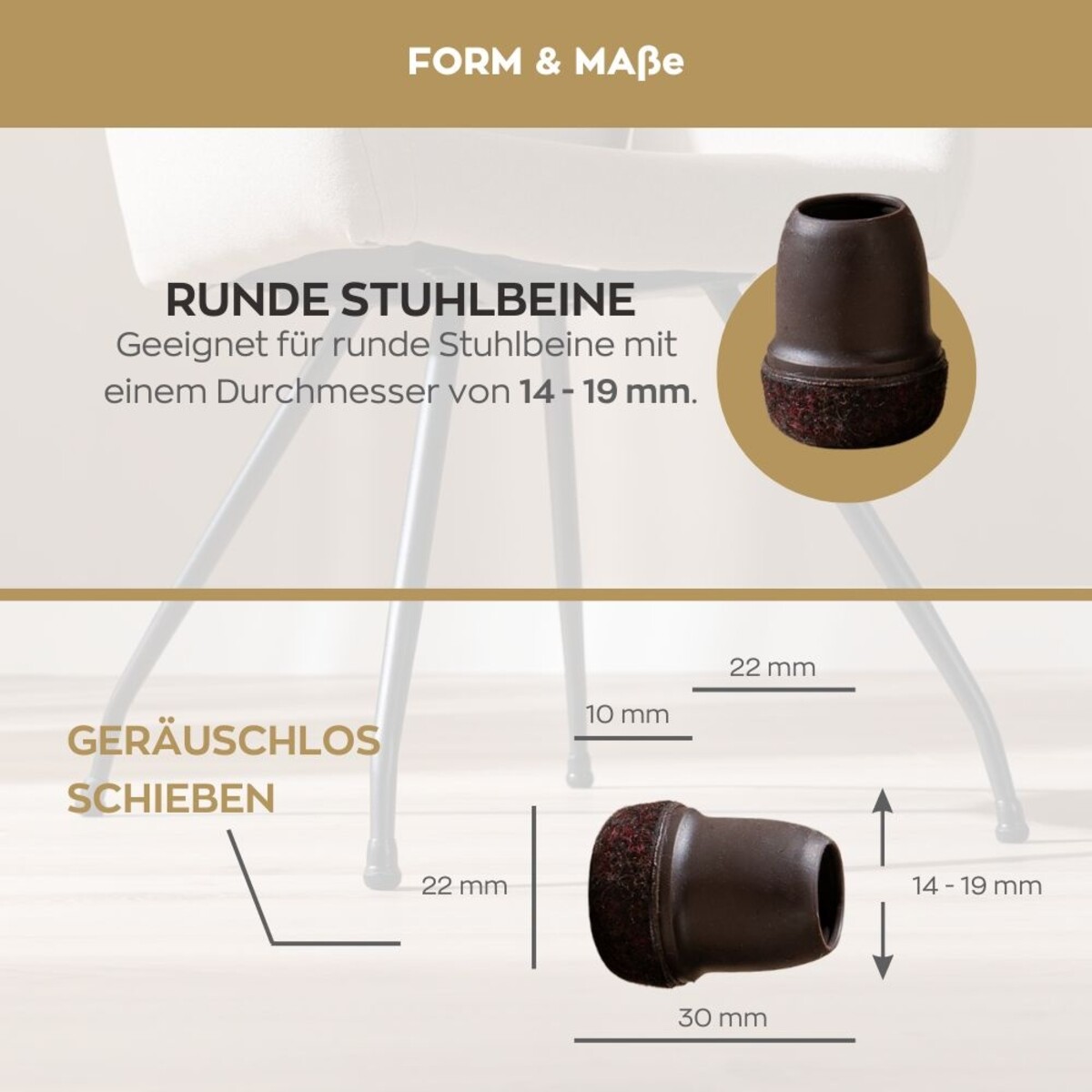 Wichtig: Miss die Stuhlbeine vorab genau aus, um die perfekte Passform zu gewährleisten, auch der Winkel der Stuhlbeine spielt eine Rolle. Die Kappen sind leicht flexibel, sodass sie sich mühelos über die Beine ziehen lassen. Schütze deinen Boden und genieße eine ruhige, kratzfreie Wohnatmosphäre mit unseren langlebigen Filzgleitern!