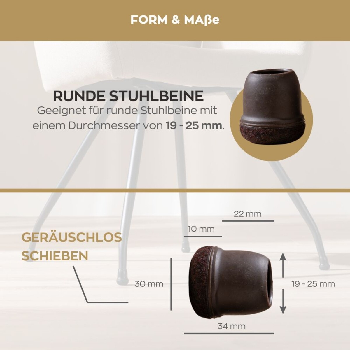 - Kein Kleben oder Schrauben nötig, einfach über die Stuhlbeine schieben.