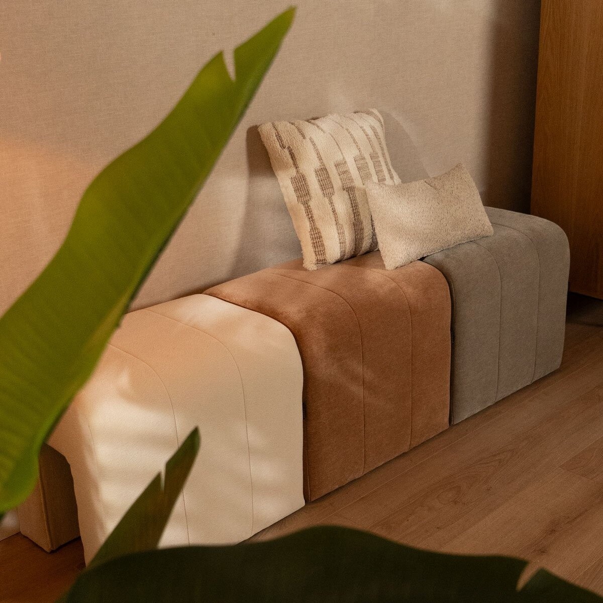 Dieser modulare Hocker ist die perfekte Ergänzung für alle, die Flexibilität und Kreativität in ihrem Zuhause schätzen. Dank des durchdachten Designs kannst du verschiedene spielerische Arrangements gestalten: Nutze ihn als komfortable Essbank, stilvolle Sitzbank am Fußende deines Bettes oder verbinde mehrere Elemente zu einer einzigartigen Sitzecke. Der Hocker lässt sich auf verschiedene Weisen platzieren, sodass du immer wieder eine neue Atmosphäre oder Funktion in deinem Raum schaffen kannst. Ideal für alle, die Abwechslung und multifunktionales Design lieben.