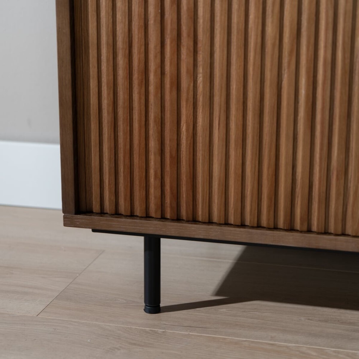 Die Fronten der Schranktüren haben ein gestreiftes Design, was dem Holzschrank ein elegantes Aussehen verleiht. Dieses Design entspricht dem Look eines Holzwandpaneels und das Möbelstück passt daher perfekt zu diesem beliebten Innentrend. Außerdem sind die Türen mit einem Soft-Close-System ausgestattet. Eine Soft-Close-Schranktür kann sehr einfach geräuschlos geschlossen werden und wird das Möbelstück nicht schnell beschädigen, wenn sie zu hart zugeschlagen wird.