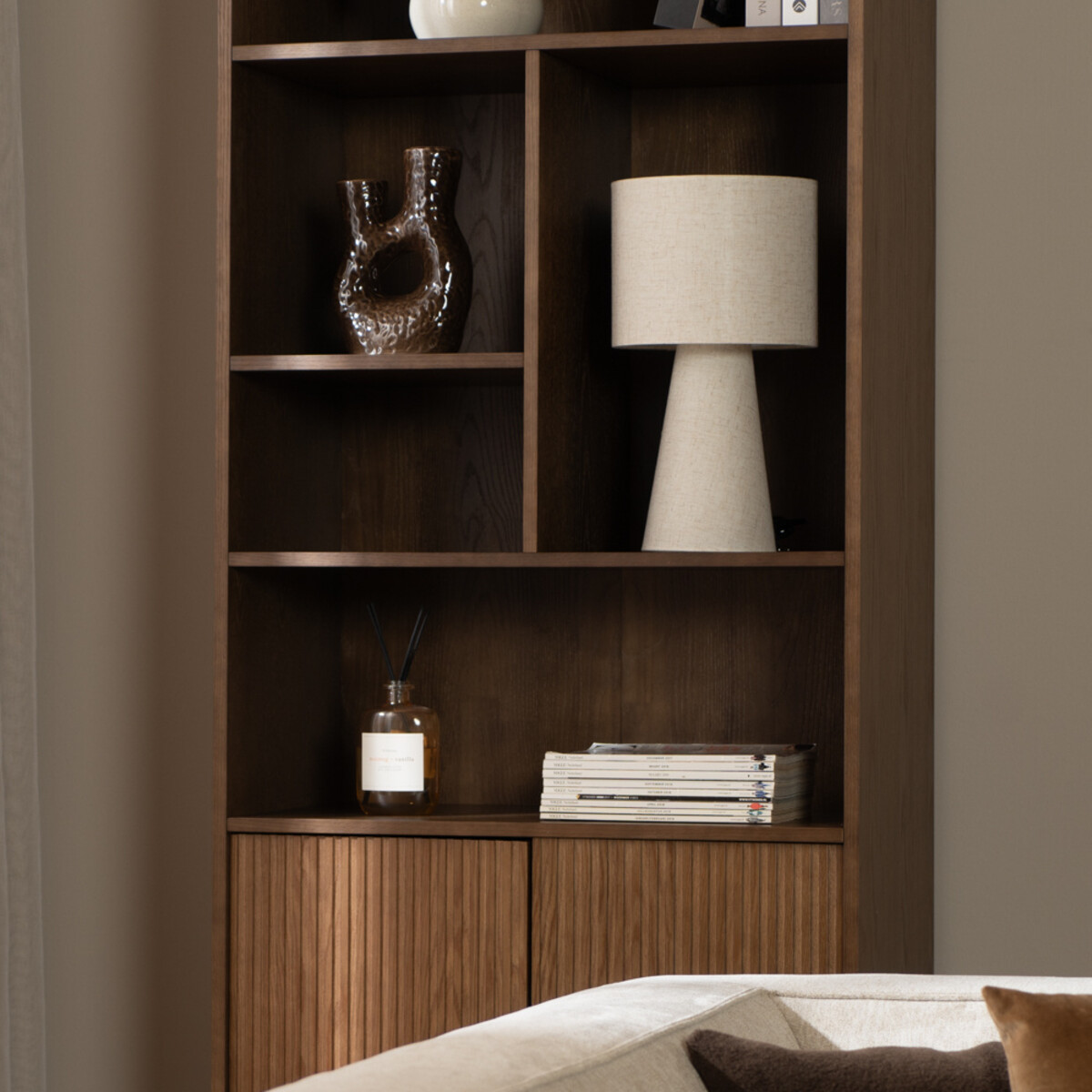Der offene Schrank Bradley is aus Rubberwood mit einer Schicht Eichenholz gefertigt, was dem Möbelstück ein rustikales Aussehen verleiht. Der Schrank ist 220 cm hoch und hat zwei Schranktüren. Dadurch wird der Raum optimal genutzt, ohne dass der offene Schrank viel Platz im Raum einnimmt. Hinter den beiden Schranktüren gibt es ausreichend Stauraum für Bücher, Dokumente oder andere Gegenstände, die nicht direkt sichtbar sein sollen. Die Regalböden im Schrank können auf die gewünschte Höhe eingestellt werden, um die richtigen Dinge zu verstauen.