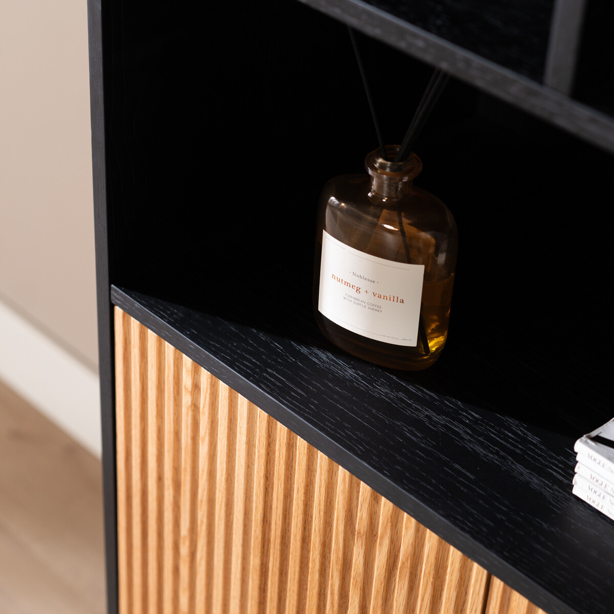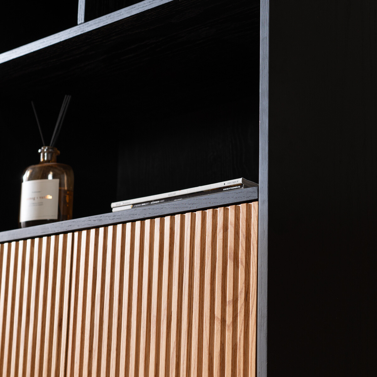 Die Fronten der Schranktüren haben ein gestreiftes Design, was dem Holzschrank ein elegantes Aussehen verleiht. Dieses Design entspricht dem Look eines Holzwandpaneels und das Möbelstück passt daher perfekt zu diesem beliebten Innentrend. Außerdem sind die Türen mit einem Soft-Close-System ausgestattet. Eine Soft-Close-Schranktür kann sehr einfach geräuschlos geschlossen werden und wird das Möbelstück nicht schnell beschädigen, wenn sie zu hart zugeschlagen wird.
