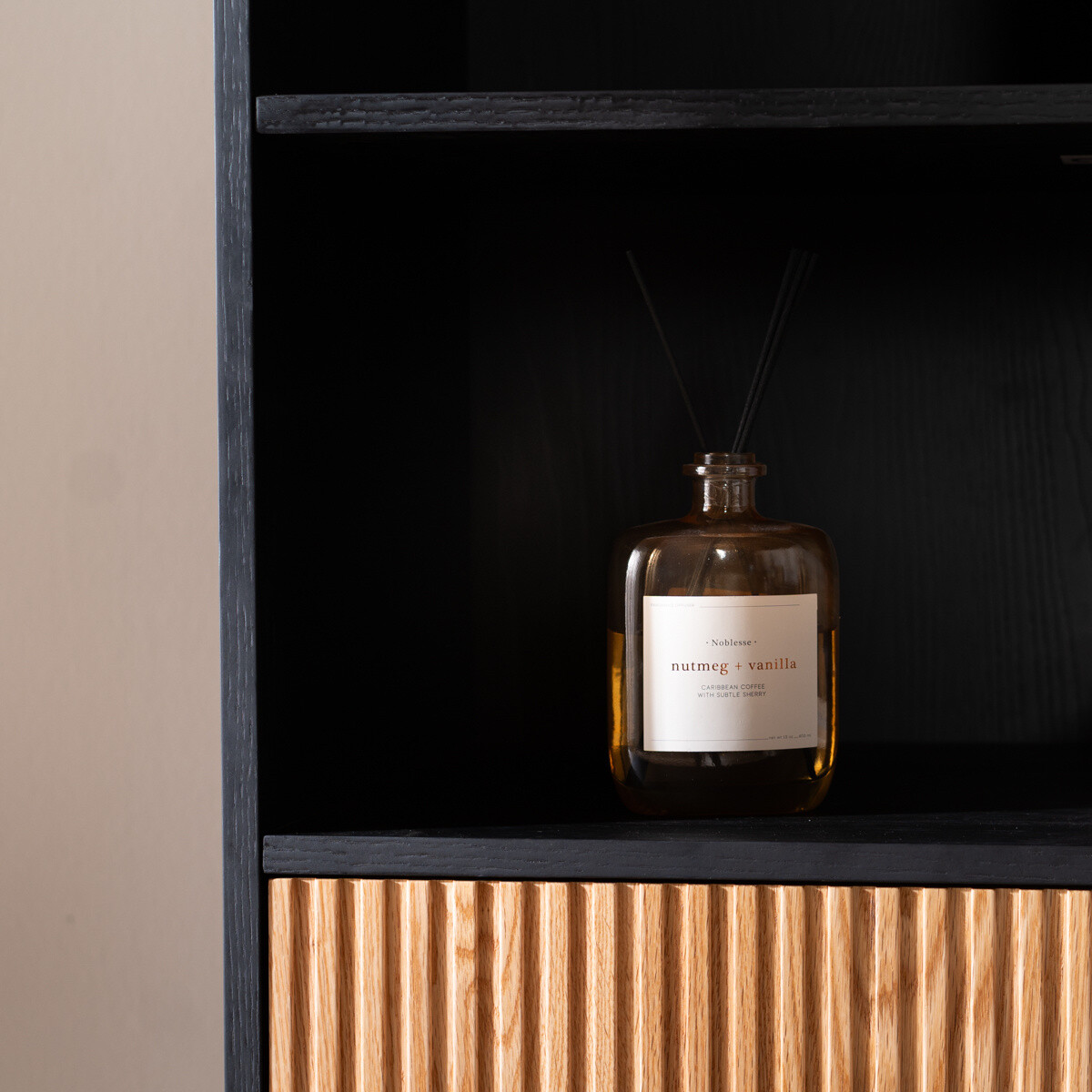 Der Schrank ist aus Rubberwood, auch Gummibaumholz oder Kautschukholz genannt, gefertigt und mit dünnem Eichenholz beklebt. Rubberwood zählt zu den ökologischsten Holzarten. Rubberwoodbäume werden hauptsächlich zur Gummiproduktion genutzt, und erst nachdem dieser Zyklus abgeschlossen ist, wird das übrig gebliebene Holz für die Herstellung von Möbeln und anderen Gegenständen verwendet. Die dünn aufgetragene Eichenfurnierschicht verleiht dem Schrank ein robustes Aussehen.