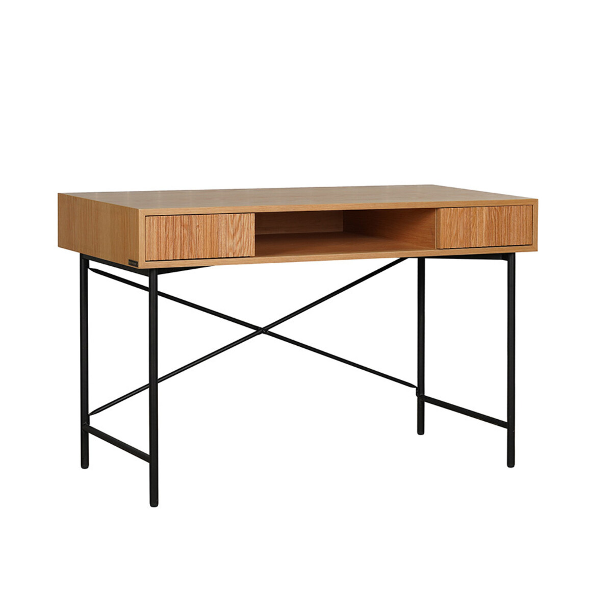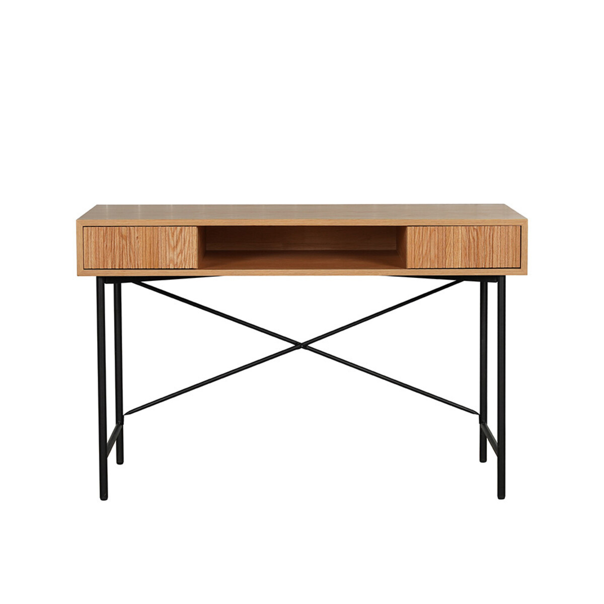 Schreibtisch Maury besteht aus Rubberwood mit einer Schicht Eichenfurnier, was den Möbeln ein rustikales Aussehen verleiht. Die beiden ausziehbaren Schubladen sorgen dafür, dass der Schreibtisch genügend Stauraum für alle deine Büroutensilien und Dokumente bietet: ideal, um zusätzlichen Platz im Büro oder im Homeoffice zu schaffen.