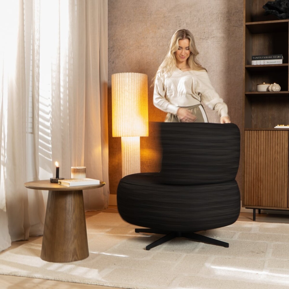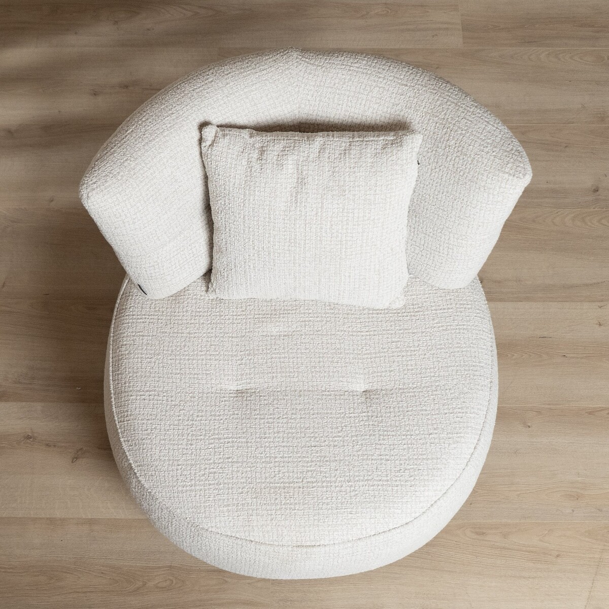 Die breite Sitzfläche bietet zusätzlichen Platz und Komfort, während das mitgelieferte lose Rückenkissen für angenehme Unterstützung und ein entspanntes Sitzgefühl sorgt. Der um 360 Grad drehbare Sessel bietet nicht nur einen komfortablen Sitzplatz, sondern verleiht deinem Wohnraum auch einen Hauch von Eleganz.