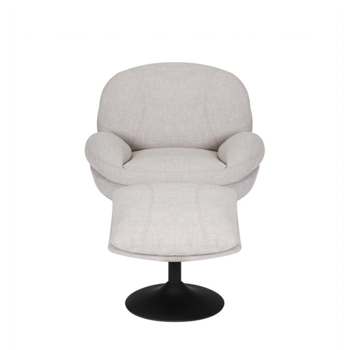 Das Besondere an dem Material dieses Polstersessels ist der 15%ige Leinenanteil neben dem Polyesterstoff. Der Stoff ähnelt einem Boucléstoff und ist wasser- sowie schmutzabweisend. Dadurch ist der Relaxsessel sehr pflegeleicht und lässt sich einfach mit einem warmen, angefeuchteten Tuch abputzen. Das drehbare Gestell ist aus einem mattschwarzen Metall gefertigt. Der Hocker ist in der Lieferung inbegriffen, daher ist es nicht möglich, den Fußhocker und den Sessel separat zu bestellen.