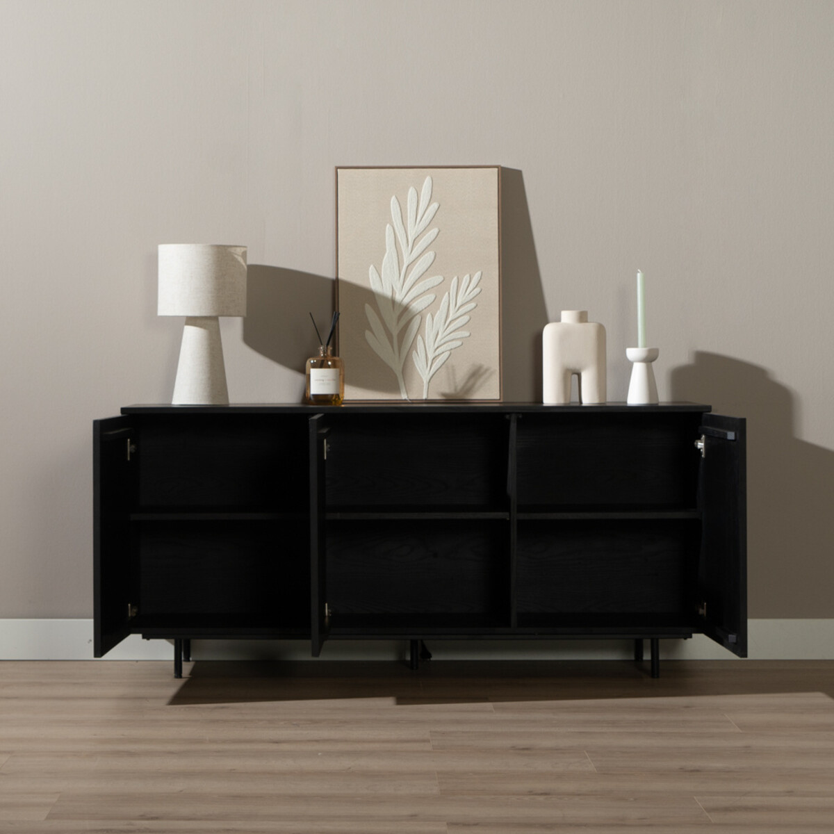 Das Sideboard Haley ist aus Rubberwood mit Eichenholz, welches in Streifen angelegt ist und dem Schrank einen einzigartigen Look verleiht. Mit drei Soft-Close Türen und sechs Fächern bietet die Kommode viel Stauraum für deine Dinge. Die Schubladen haben ein gestreiftes Design, sodass das Sideboard aus Holz sehr elegant aussieht. Das Sideboard kann auch im Flur genutzt werden. Du kannst einfach eine schöne Blume oder Kerze darauf stellen, um ihn zu dekorieren. Somit ist das Sideboard Haley flexibel einsetzbar und in jedem Fall ein Hingucker!