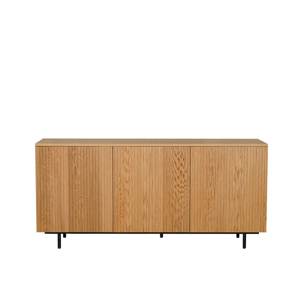 Der hölzerne Schrank Haley hat die Maße 160x45 cm und ist aus Rubberwood, auch Gummibaumholz oder Kautschukholz genannt, gefertigt und mit dünnem Eichenholz beklebt, welches in Streifen angelegt ist. Dieses Holz ist unempfindlich gegenüber Feuchtigkeit, sodass es eine gute Alternative zum klassischen Holz ist. Du kannst das Sideboard einfach mit einem angefeuchtetem Tuch reinigen. Das 74 cm hohe Gestell des Sideboards ist aus schwarzem pulverbeschichtetem Metall gefertigt, wodurch die Kommode sehr stabil ist. Das Möbelstück ist bei der Lieferung bereits vollständig montiert, aber du musst die Beine unter dem Möbelstück noch selbst anbringen.