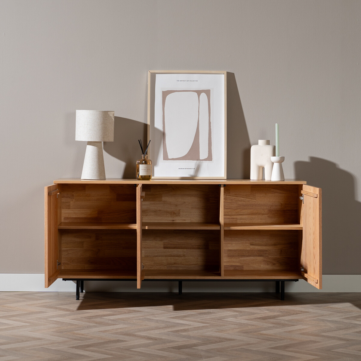 Das Sideboard Haley ist aus Rubberwood mit Eichenholz, welches in Streifen angelegt ist und dem Schrank einen einzigartigen Look verleiht. Mit drei Soft-Close Türen und sechs Fächern bietet die Kommode viel Stauraum für deine Dinge. Die Schubladen haben ein gestreiftes Design, sodass das Sideboard aus Holz sehr elegant aussieht. Das Sideboard kann auch im Flur genutzt werden. Du kannst einfach eine schöne Blume oder Kerze darauf stellen, um ihn zu dekorieren. Somit ist das Sideboard Haley flexibel einsetzbar und in jedem Fall ein Hingucker!
