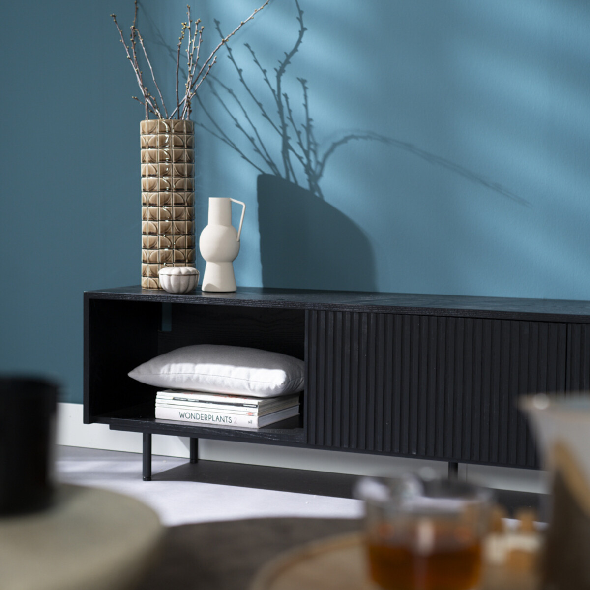 Tipp! Der TV-Schrank Ray ist auch in anderen Farben und in einer 150 cm breiten Variante erhältlich. Der Fernsehschrank gehört zur Panel-Kollektion, zu der auch ein Nachtschrank, ein Schreibtisch und ein Schrank gehören. Kombiniere die Möbelstücke miteinander, um ein stimmiges Gesamtbild in deinem Interieur zu schaffen.